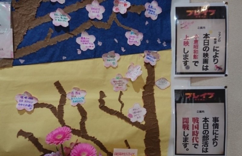 今回の上映作品は彼の主演作品ではありませんが、このような心づかいがされており筆者は大変感激しました。 会ったことはない有志の方へ感謝をしながら、春らしい桜のカタチをしたメッセージカードに想いを書いて、ペタリと「木」に咲かせました。