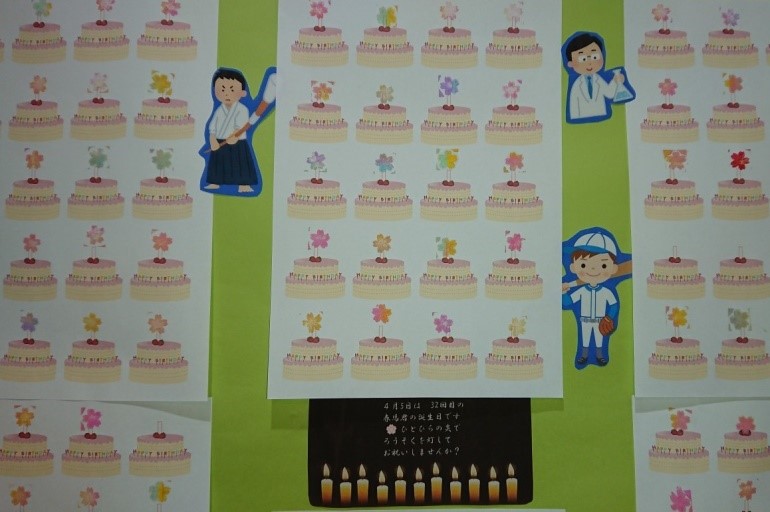 さらに4月は彼の誕生月。バースデーケーキの台紙に、桜の型スタンプ(ケーキのロウソクの炎に見立て)を押すことができる演出もありました。