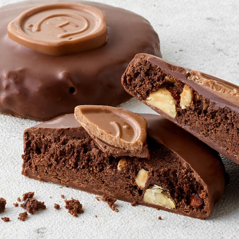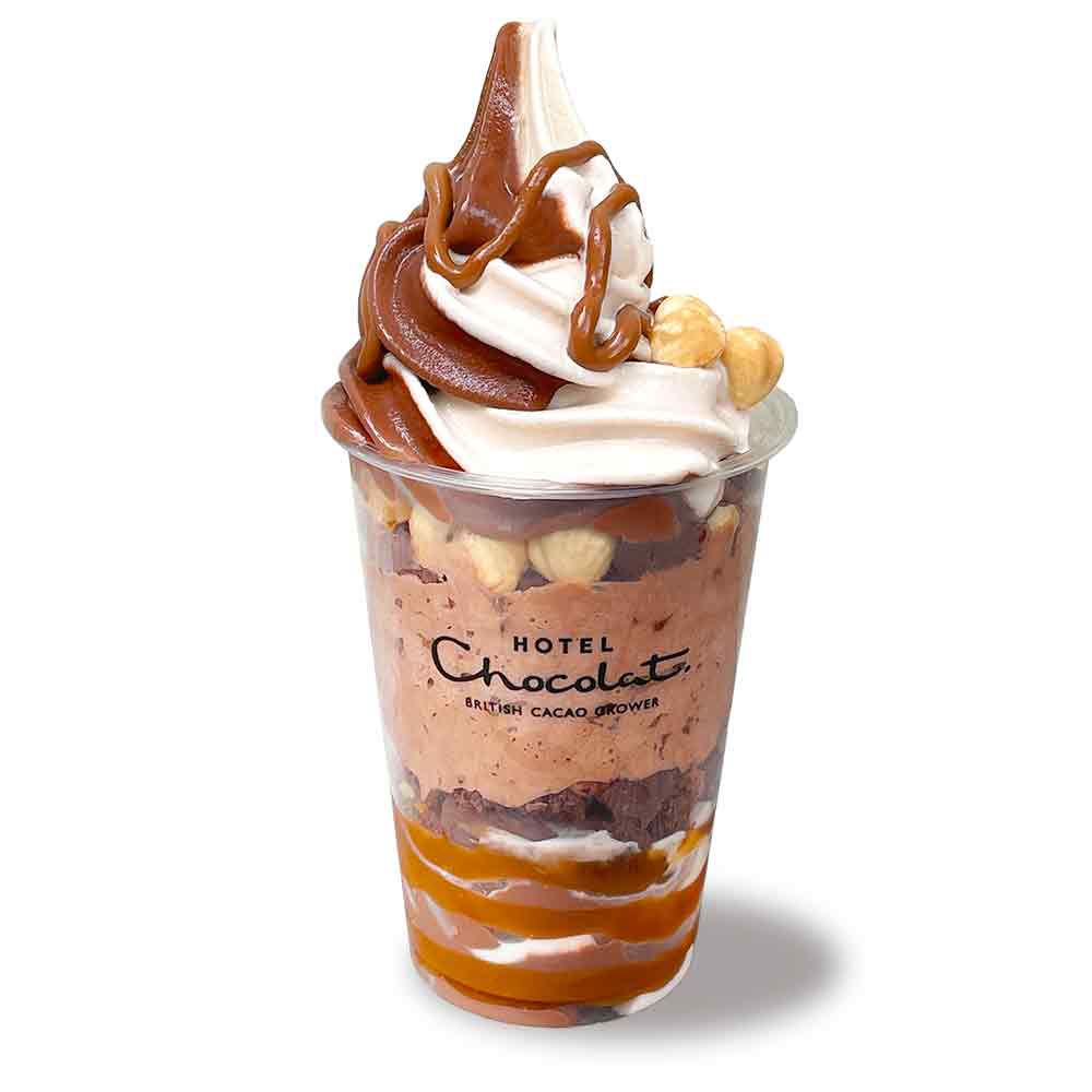 細かく砕かれた「クッキーズ リュクス」で、ヘーゼルナッツのザクザク食感を加えています。さらに、カカオ85%のホイップでほろ苦さもプラス。カカオアイスには、ソルトキャラメルとヘーゼルナッツの2種のソースを贅沢に使用しています。