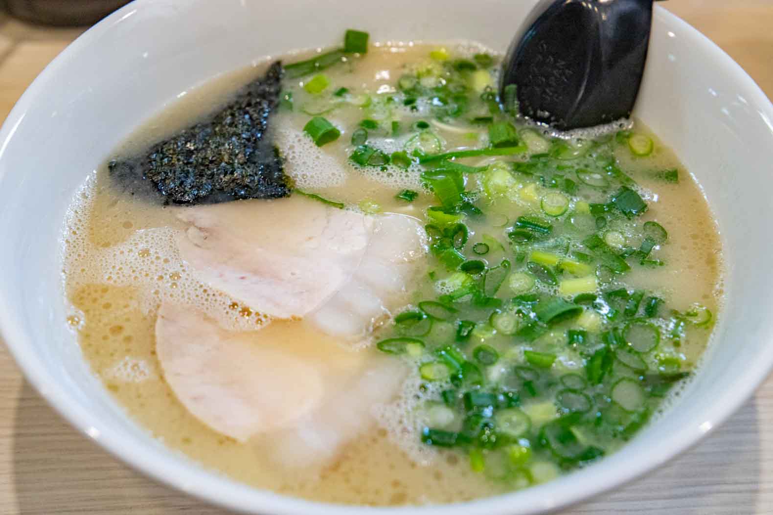 メニューは、チャーシューとネギ、海苔がトッピングされたシンプルな「ラーメン」(700円)と「ワンタンメン」(800円)、「チャーシューメン」(1000円)という構成です。あっさりとした豚骨スープですが、コクがありクリーミーで細麺と相性バッチリ。そこに癖になりそうな独特の味わいのチャーシューやたっぷりのネギがいいアクセントになっていて、飽きのこない一品です。