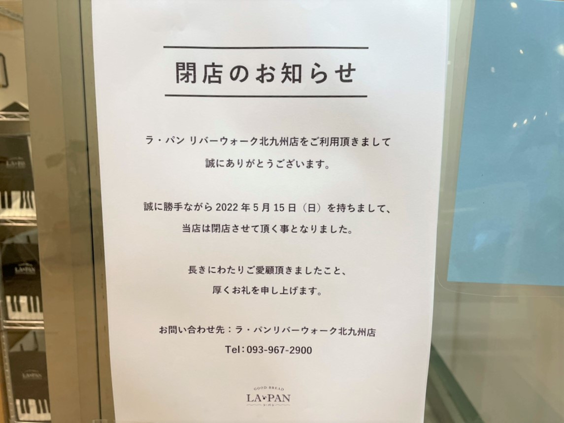「ラ・パン リバーウォーク北九州店」のお店の前にあった貼り紙によると、店舗移転のためとのことですが、お店の人に移転先を尋ねたところ移転場所は未定だそう。移転場所が見つかり次第、ホームページで情報を発信するとのことでした。