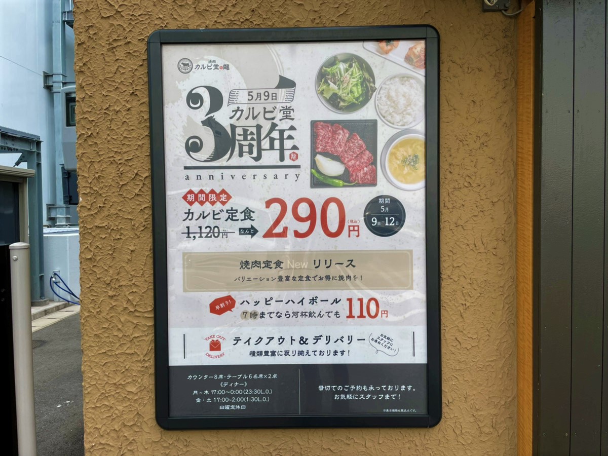 お店の外には3周年記念として、通常価格1120円の「カルビ定食」を290円で提供すると看板がありました。