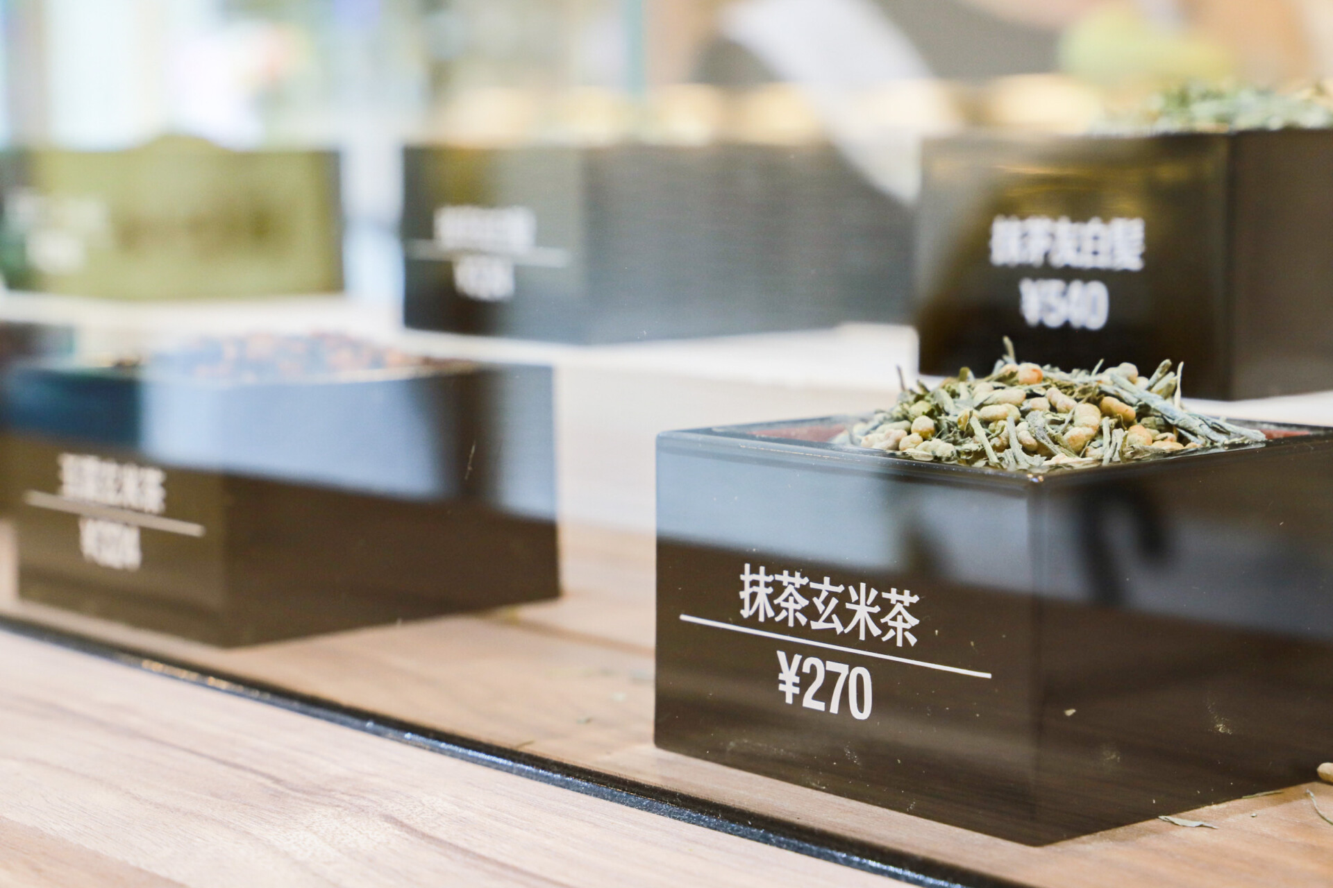 入り口付近のショーケースにはさまざまな種類の茶葉が並べられており、100グラムから販売を行なっています。