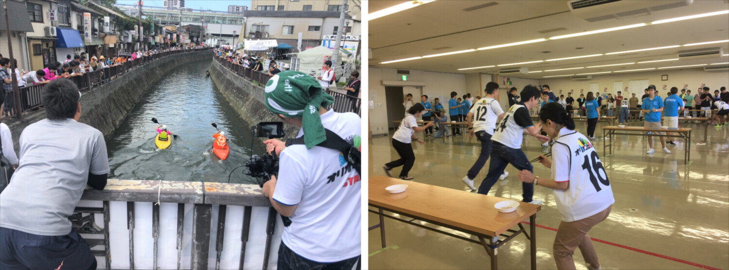 過去の「オリオンピック」の様子 カヌー(写真左)と豆運びレース(同右)