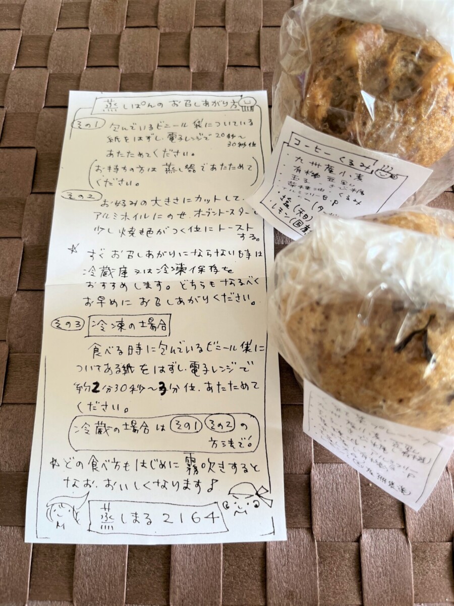 取材後、思わず蒸しパンを購入してお家に帰って袋を開けると、おいしい食べ方のコツが丁寧な字で書かれた説明書が入っていました。