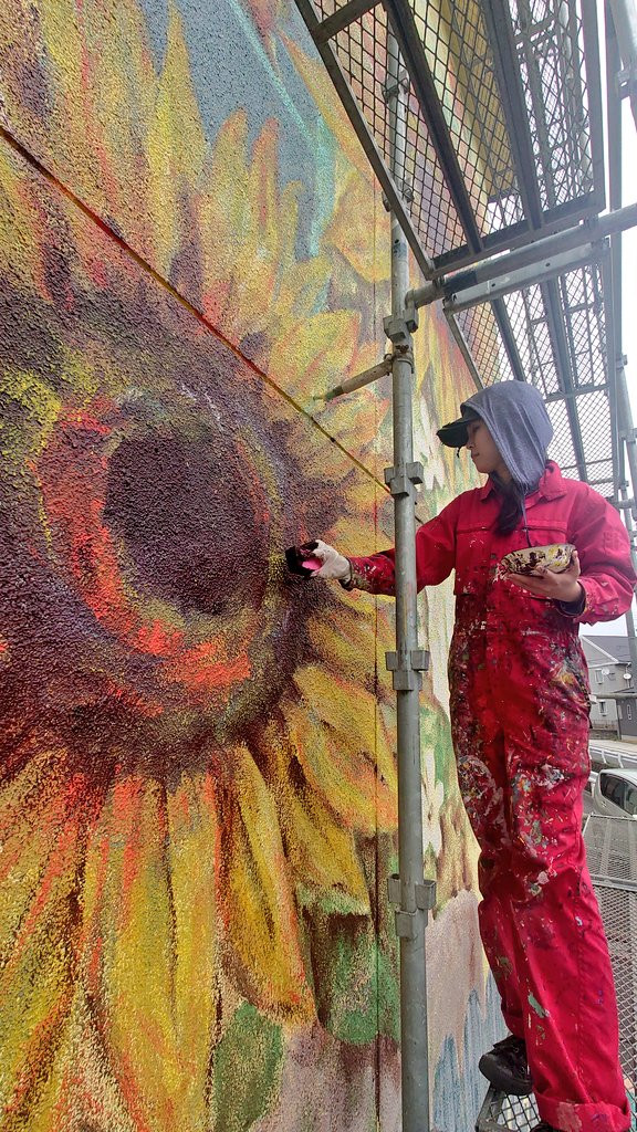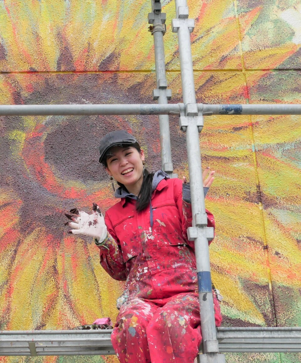 そこで今回の物件ではいろいろな色を使ったカラフルな絵にしてほしいという今橋さんの希望もあり、北九州市の花である「ヒマワリ」をメインモチーフにしようということは今橋さんとリサさんの間ですぐ決まったと言います。