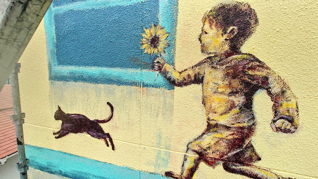 片方の壁面には家族にプレゼントするためのヒマワリを手に持った男の子が黒猫を追いかけている様子が、もう片方の面では男の子からヒマワリをプレゼントされ、笑顔を見せるお母さんと男の子を抱きかかえるお父さんという幸せな家族の姿が描かれました。