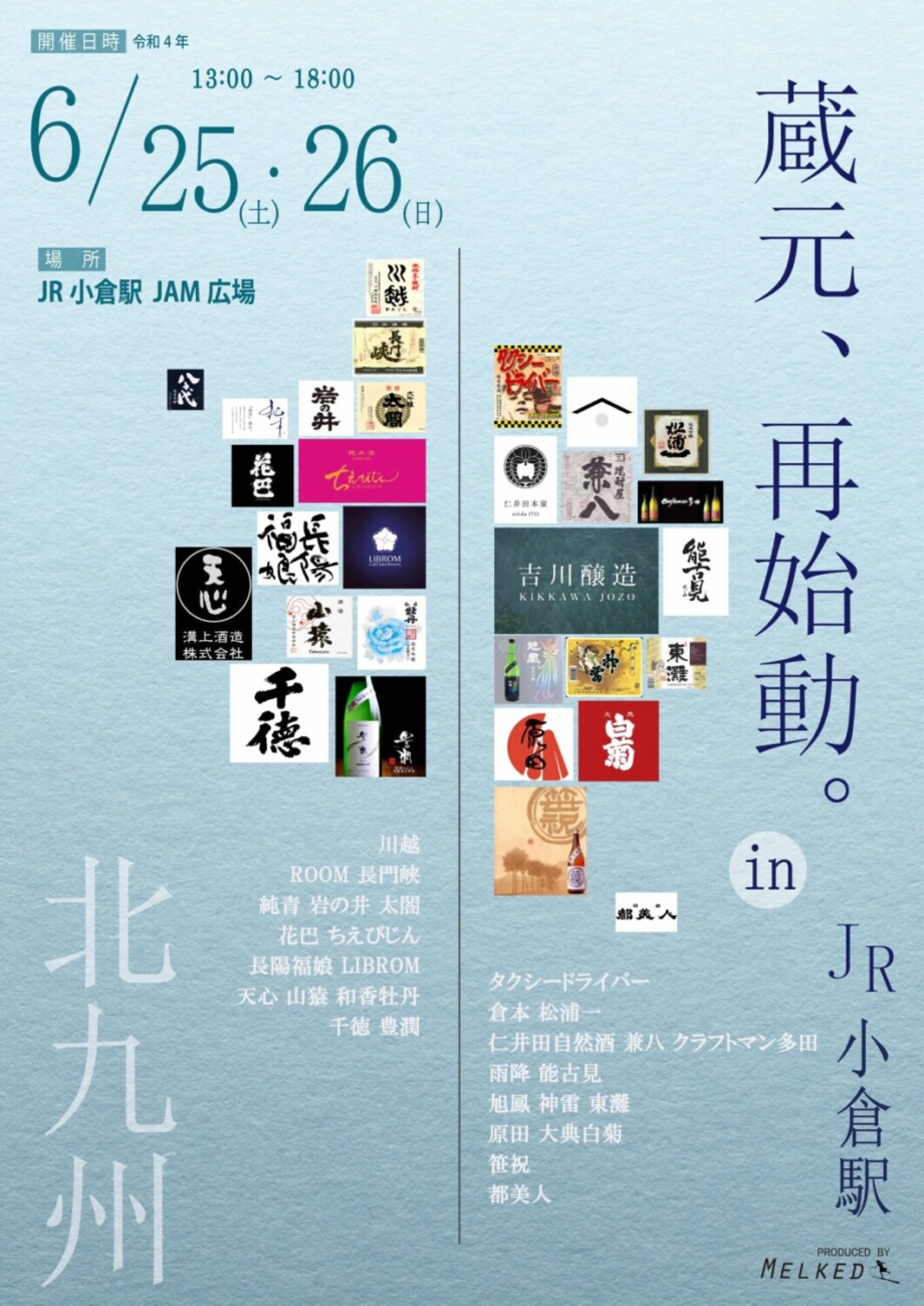 6月25日(土)・26日(日)の午後1時~午後6時、2日間合わせて30蔵以上が出店する九州最大級の日本酒イベント「蔵元、再始動。」がJR小倉駅内のJAM広場・ビエラ小倉などで初開催されます。