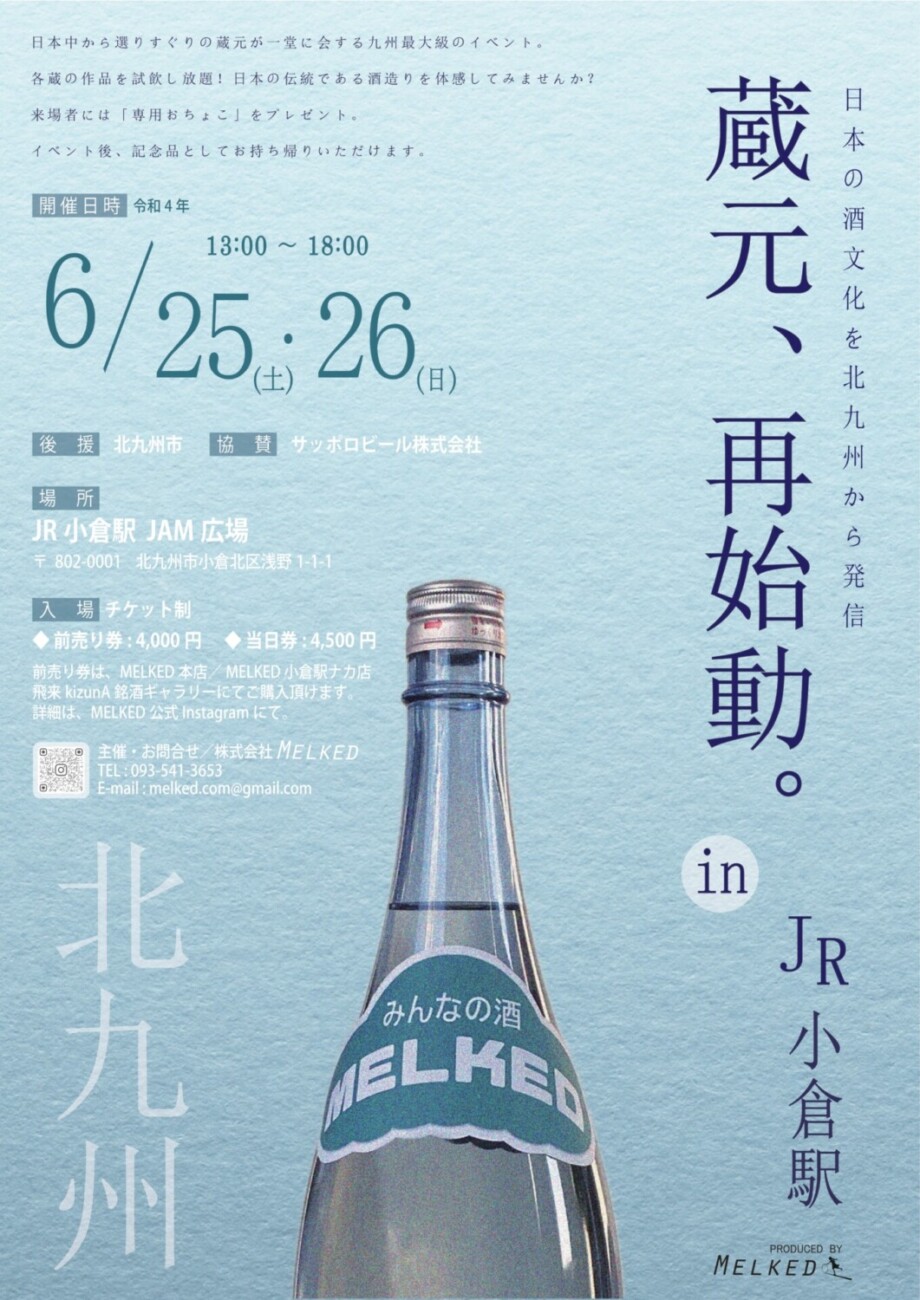6月25日(土)・26日(日)の午後1時~午後6時、2日間合わせて30蔵以上が出店する九州最大級の日本酒イベント「蔵元、再始動。」がJR小倉駅内のJAM広場・ビエラ小倉などで初開催されます。