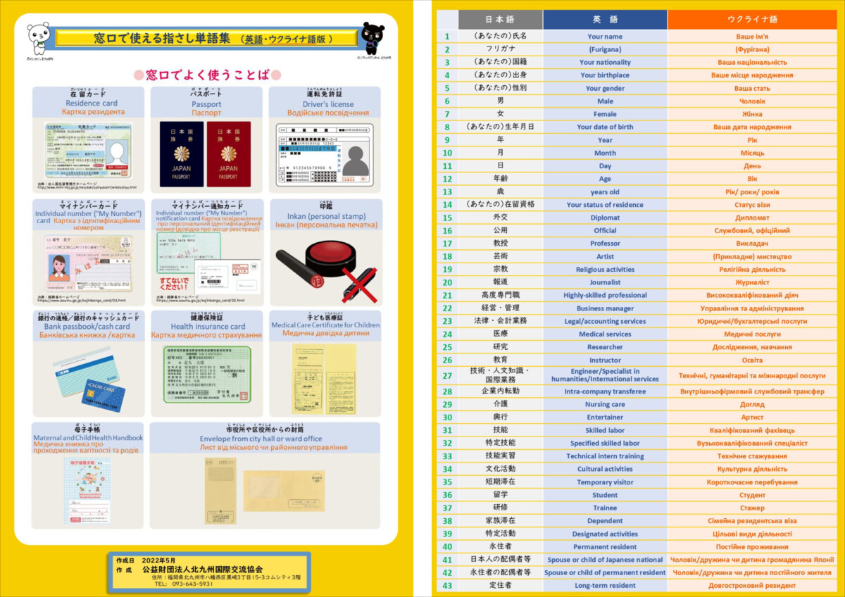今回登場したウクライナ語版を含め「窓口で使える指さし単語集」は、「北九州国際交流協会」ホームページからダウンロード可能です。