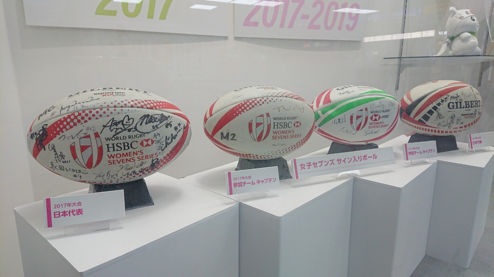 その他にも、女子セブンズのサイン入りボール、ラグビーワールドカップ2019ピンバッジなども展示されています。