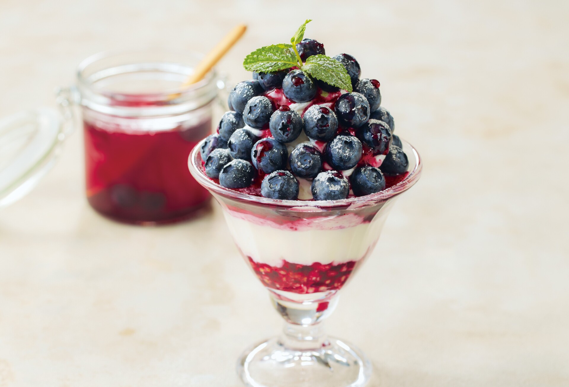 「フレッシュブルーベリーパフェ」は、ヨーグルトに約80グラムのごろごろフレッシュブルーベリーと、濃厚なブルーベリーソースを合わせた爽やかなパフェです。