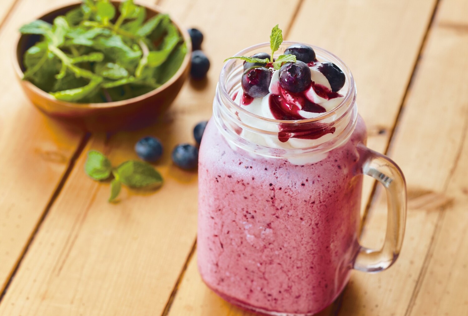 ヨーグルト、フレッシュブルーベリー、ブルーベリーソースを合わせた「フレッシュブルーベリースムージー」は、甘酸っぱくてなめらかな、ひんやりスムージー。