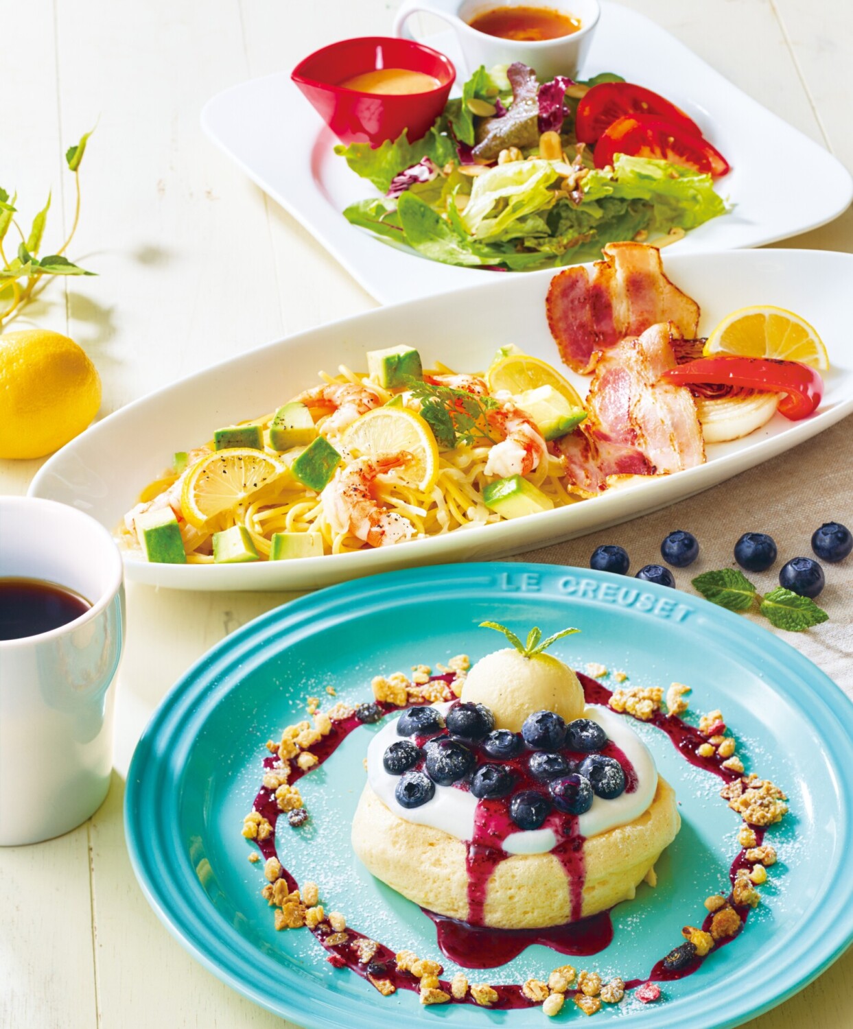 「サマーナイスデイコース」(全4品)は、フレッシュサラダ&ミネストローネスープ・海老とアボカドの塩レモンパスタ・フレッシュブルーベリーのパンケーキ(ハーフ)・選べるドリンクがセットになっています。「むさしの森珈琲」のおいしさを丸ごと楽しめる全4品のコースも堪能してみたくなりますね。