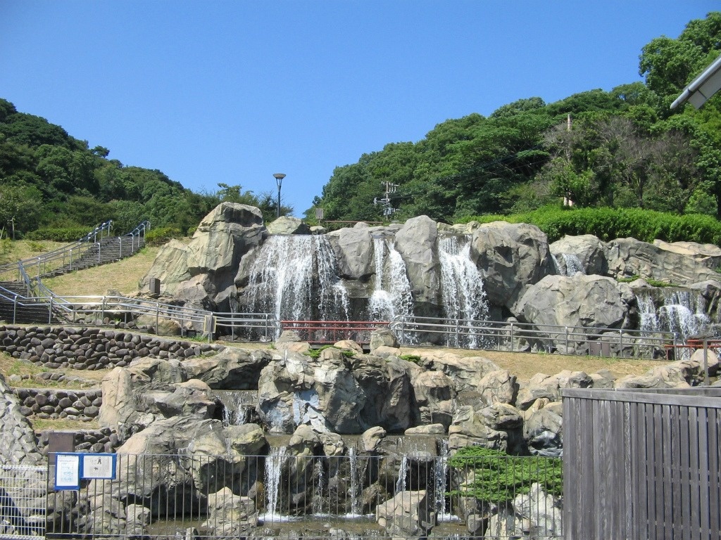 細長い「金毘羅池」の周辺にはジョギングコース、大滝、噴水、管理棟、カフェ、花壇、デッキ、ビオトープ、健康ロードなどの施設があります。
