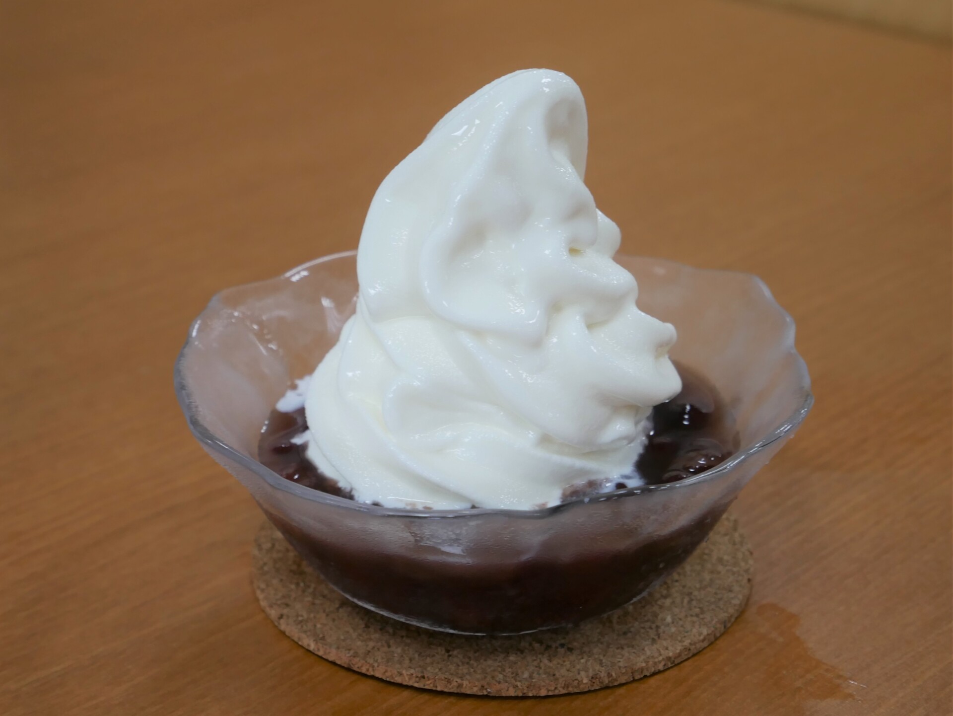 かき氷以外にもさまざまなメニューが揃う同店には、ソフトクリーム&ぜんざいが楽しめる「抹茶クリぜん」「クリぜん(写真下)」、シロネコクリームソーダ「メロン」「いちご」、「キャラメルコーヒーフロート」、瀬戸内無農薬レモンを使用した夏季限定の新商品「レモネード」など、気になるメニューが満載。柳川市の人気店「椛島氷菓店」のアイスキャンディーも8種類販売されており、あれもこれも食べたくなってしまいます。