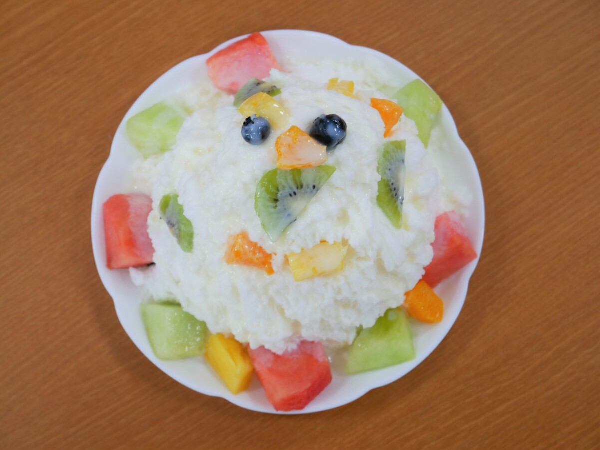 今回は、一番人気だという「白ねこ」を注文してみました。旬のフルーツがゴロッとトッピングされたミルク氷はふわふわ食感。フルーツは、併設する「海と大地」から仕入れているため、時期によってトッピング内容が変わることがあるそうで、取材日は大きめにカットされたスイカやメロン、ブルーベリーなどがふんだんにあしらわれていました。