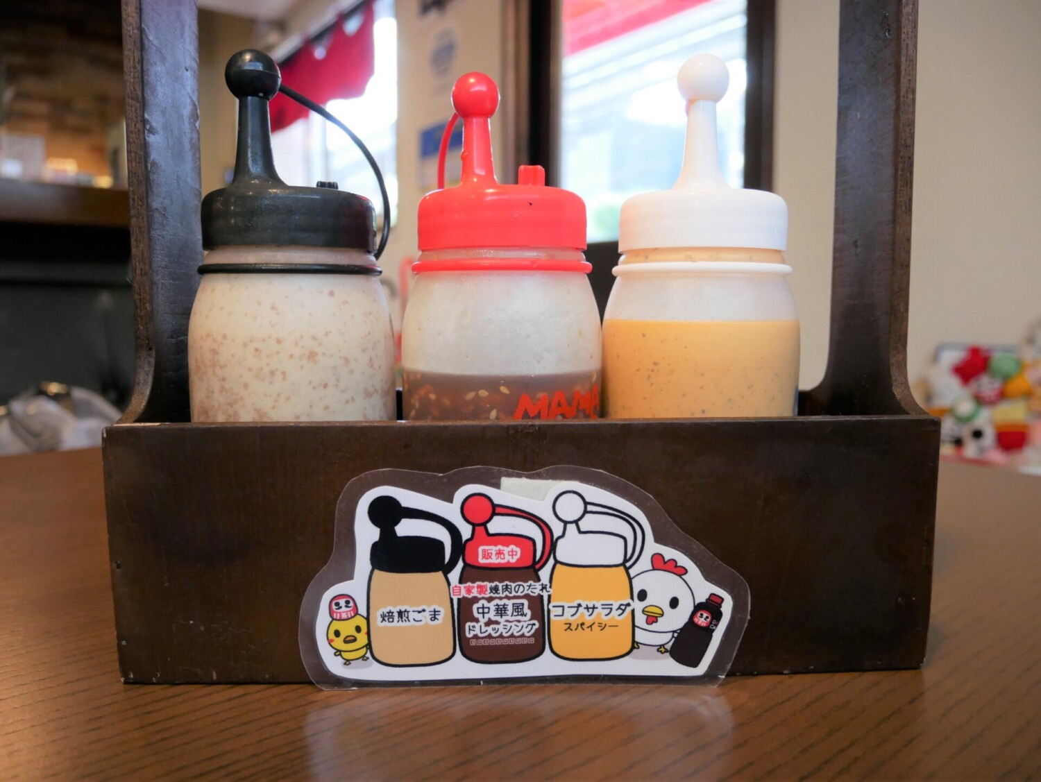 サラダ&ポテトサラダもついているので、ナポリタンだけだと野菜が少なめなのが気になるというの心配も解消してくれます。ドレッシングは3種類用意されていますが、ここでもやはり自家製の焼肉のたれを使ったものが目に留まります。