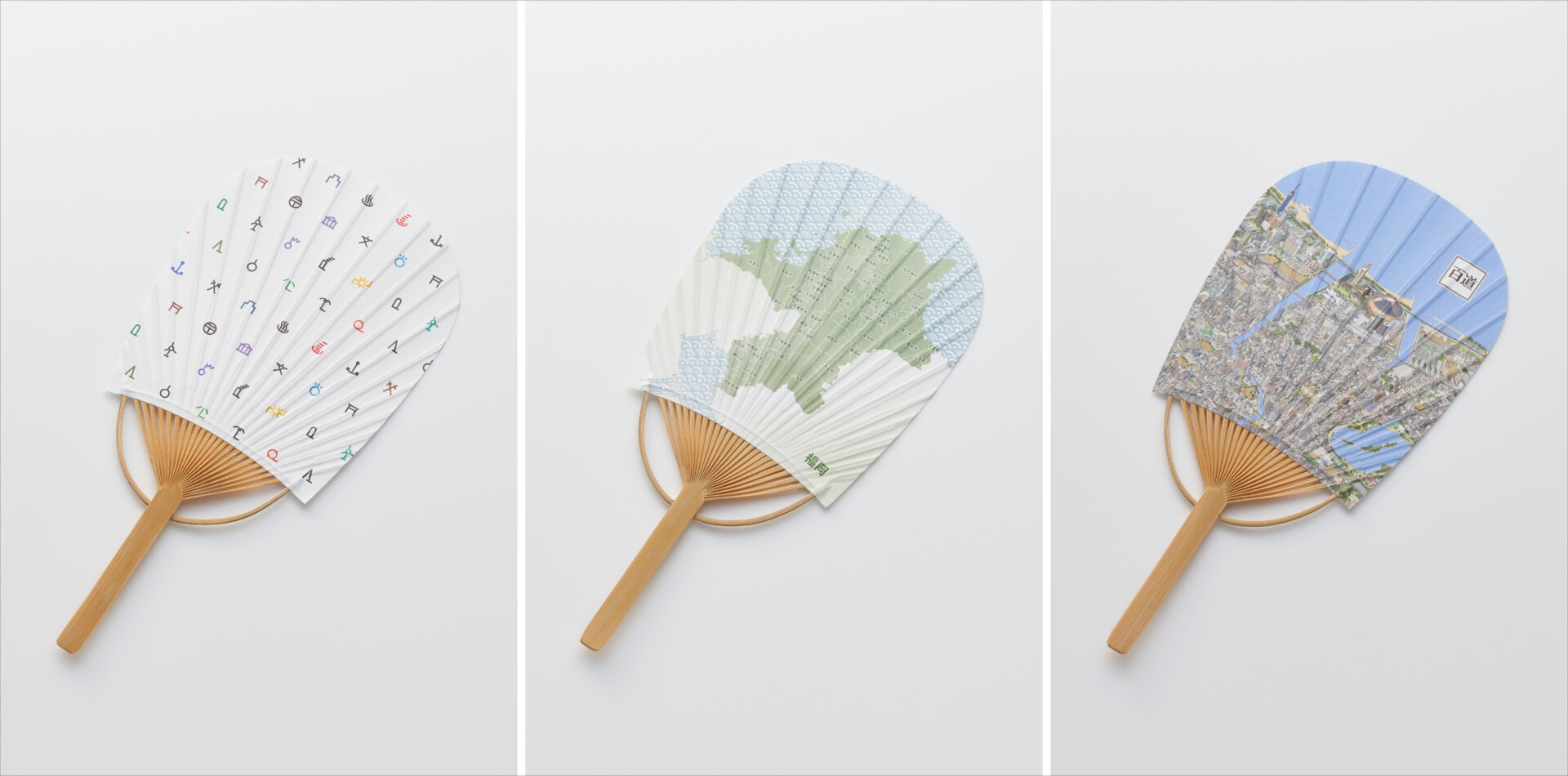 ミニうちわレター「地図記号」(写真左)・「福岡県」(同中央)、「百道3D」(同右)
