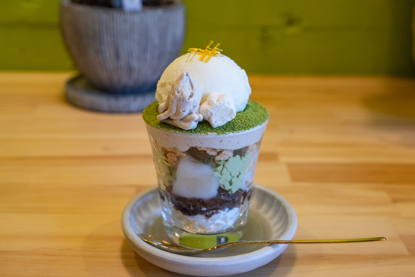 セットでついてくるパフェは「季節のパフェ」「ティラミス」「抹茶」の3種から選ぶことができ、今回は抹茶を選んでみました。バニラアイスが中央にのっていて、スプーンを入れると抹茶のブラウニーや白玉、フレークにあんこがぎっしりと入っていて、見た目のサイズ以上にボリューム感と、さまざまな食感を一緒に楽しめて、最後までスプーンが止まらず、一気に完食してしまいます。パフェはテイクアウト(550円から)も可能です。