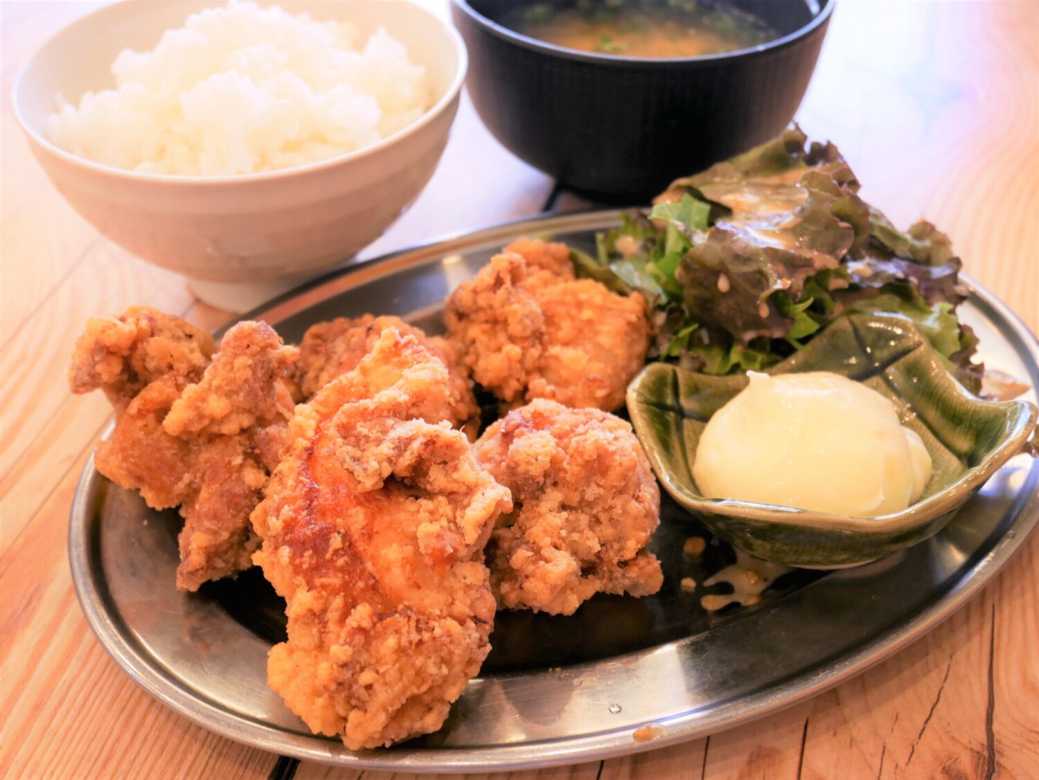 人気ナンバーワンは、国産鶏の唐揚げ定食。カラッと揚げられた大きめサイズの唐揚げが5個ついてきます。
