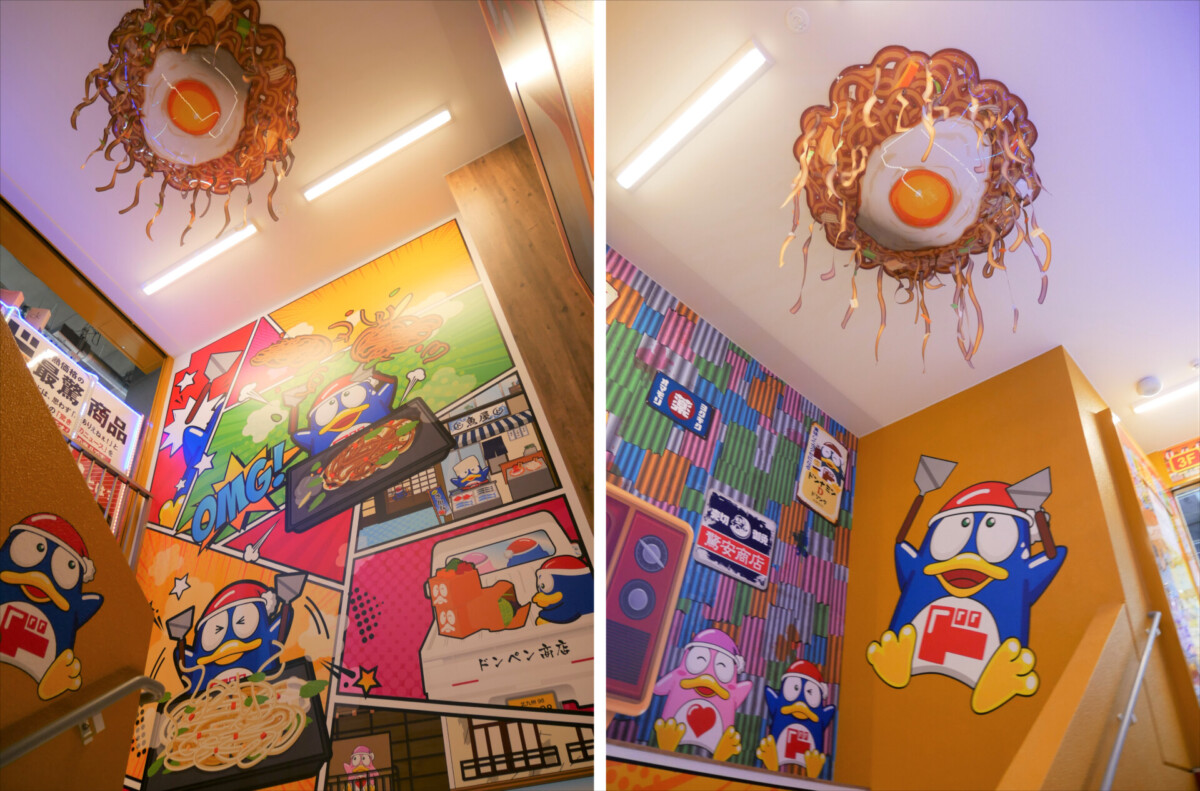 階段の上から見ても、階段の下から見ても、「焼うどん」の装飾と壁に描かれたそれぞれのイラストがマッチして、小倉っぽい写真を撮ることができます。