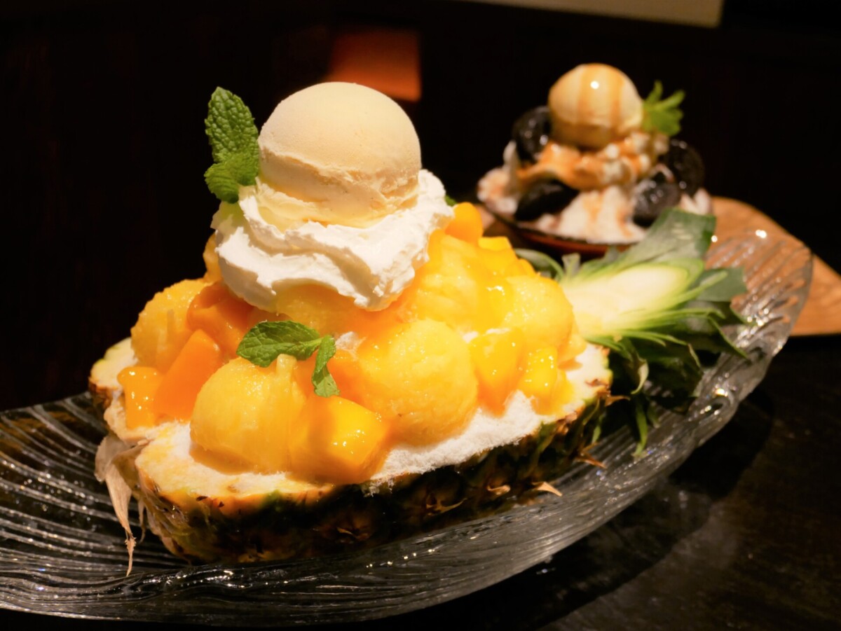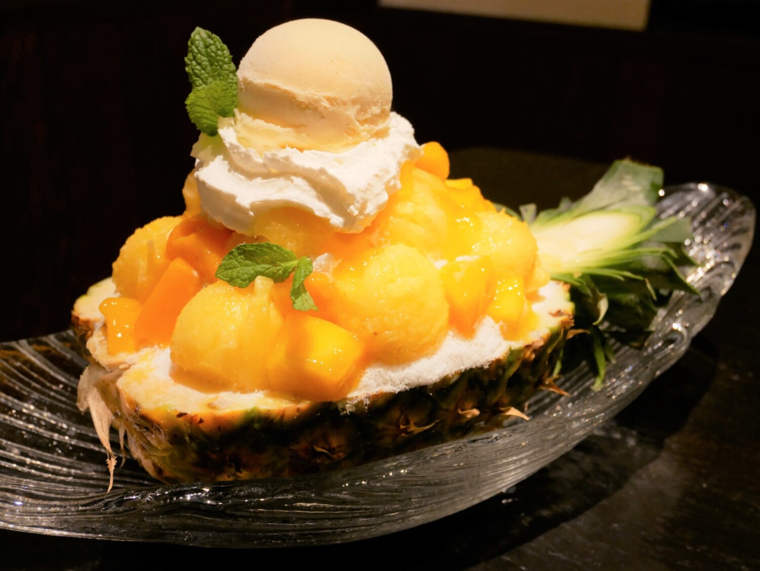 期間限定の「パイナップルのYUKI」は、パイナップルそのものが器になっているので、見た目のインパクトにまず驚かされます。ジューシーなパイナップルとマンゴーが入っているので食べ応えも十分。さっぱりとした味わいなので、どんどん食べ進みます。