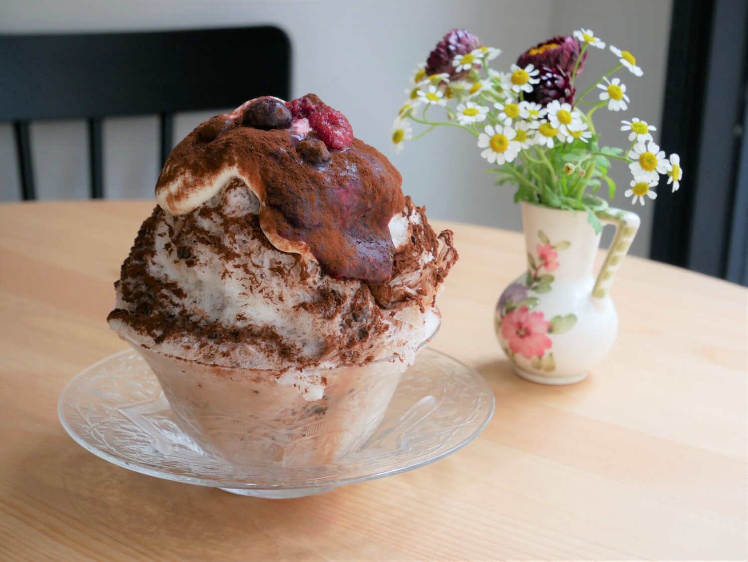 かき氷は「イチゴミルク」「抹茶金時」「黒蜜きな粉」「マンゴー」の4種類がありますが、フルーツは旦過市場のものを使っているとのこと。一押しは「イチゴミルク」。氷屋さんに特別に頼んでいるという氷を丁寧に削り、自家製のイチゴシロップとミルクをたっぷりとかけていきます。おいしさをそのまま閉じ込めたフローズンいちごをふんだんに盛り付け、バニラアイスをトッピング。さらに朝立て生クリームをそっと添えて完成です。