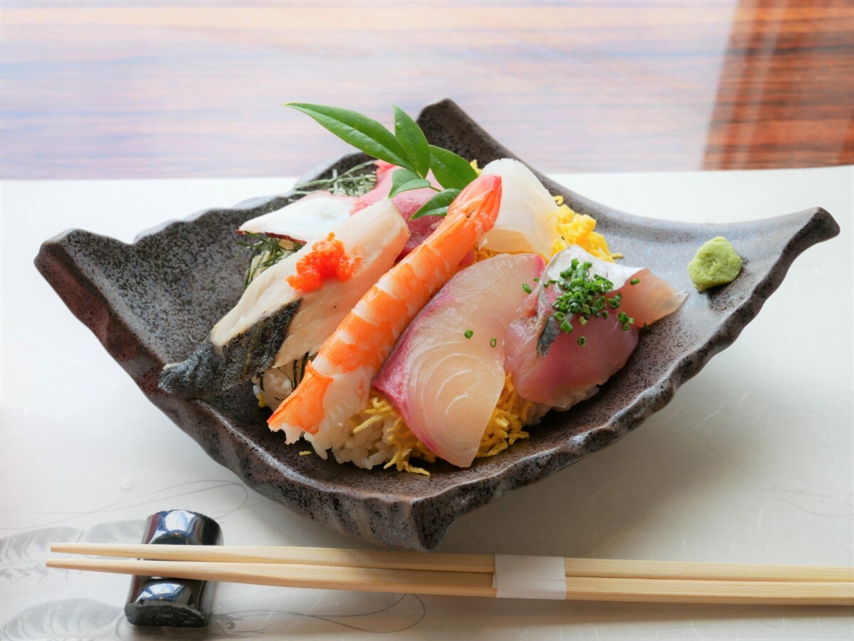 平日限定のランチメニュー「握りランチ」「海鮮ちらし」は、いずれも小鉢・赤だし・茶わん蒸し付きです。通常1580円ですが、今だけ1280円とお得に味わうことができます。新鮮な魚を美しく盛り付けた「海鮮ちらし」は、魚介類の新鮮さはもちろん、一つ一つ食べ応えがある大きさのネタも満足できます。見た目に反して、しっかりごはんも入っているので、食べ応えも十分です。