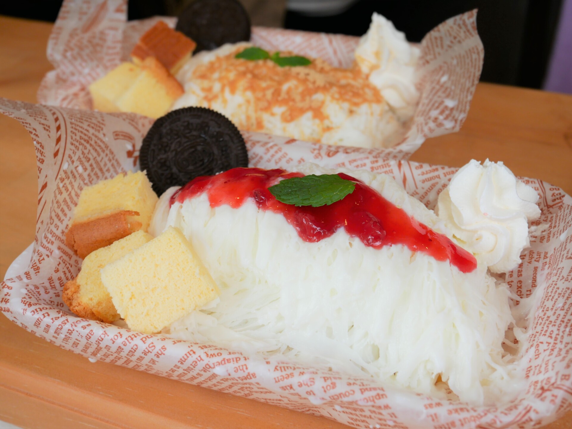 味がついた氷を糸状に削っているので、そのままでも甘く、口に入れた瞬間、ほどけるように溶けていきます。氷の下から姿を見せる台湾カステラの食感もふわふわですが、氷のふわふわ食感とは全然違う味わいで、「韓国アイス」と「台湾カステラ」のふわふわコラボレーションに嬉しくなります。