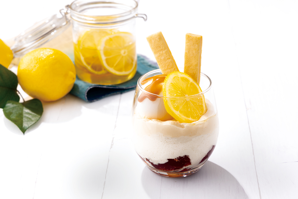 「はちみつレモンティーグラス」は、国産の有機紅茶を使用した紅茶ゼリー、北海道産はちみつのクリーム、そしてフロマージュクリームという3層仕立てのグラスデザートに、レモンシャーベットとはちみつ漬けレモンをのせたもの。さっぱりしたレモンの酸味と紅茶が香る、暑い夏に嬉しいグラスデザートです。