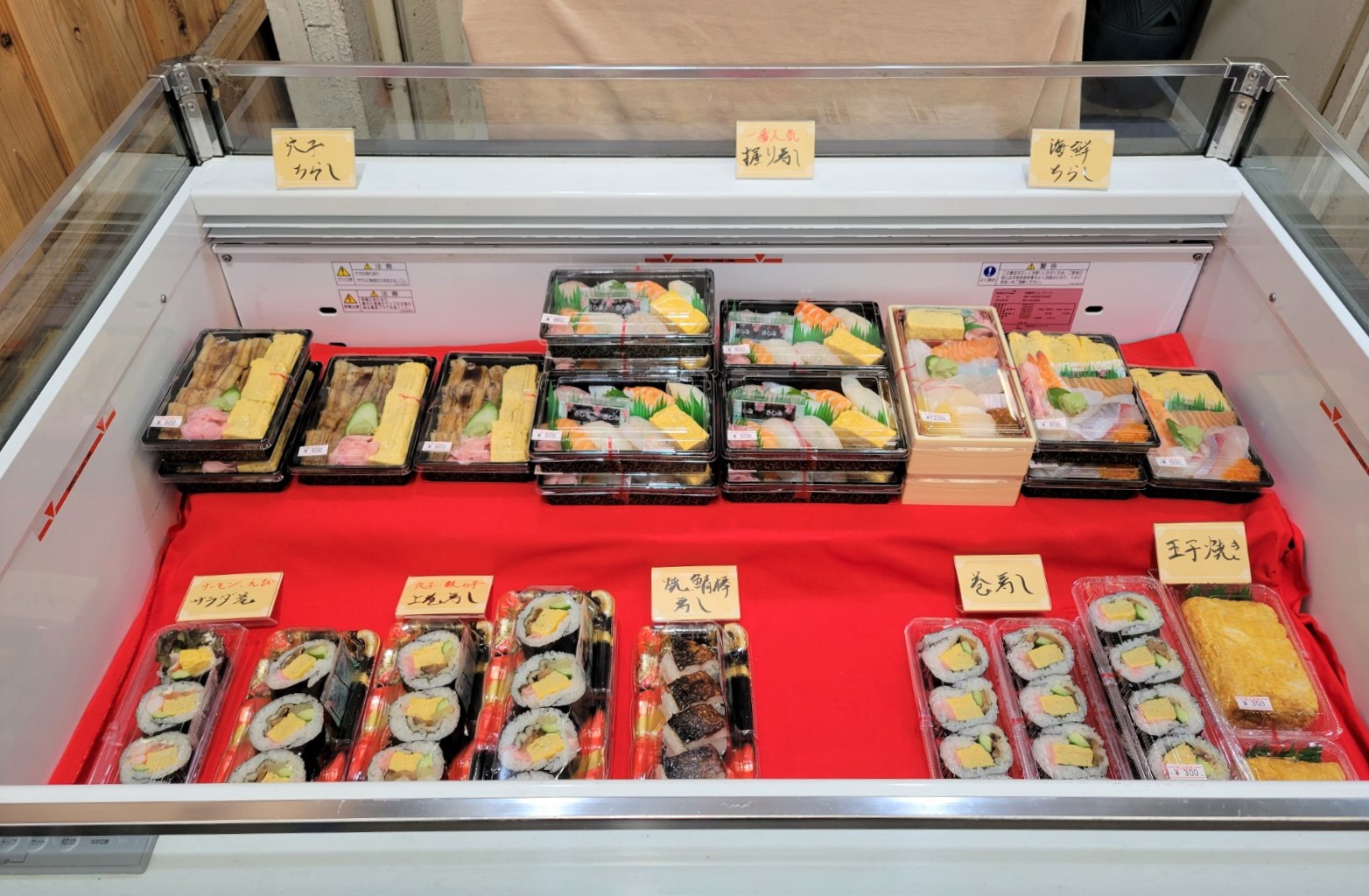 取材日の店頭には、「握り寿し」「海鮮ちらし」「穴子ちらし」「巻き寿司」「焼鯖棒寿し」「玉子焼き」などが並んでいました。
