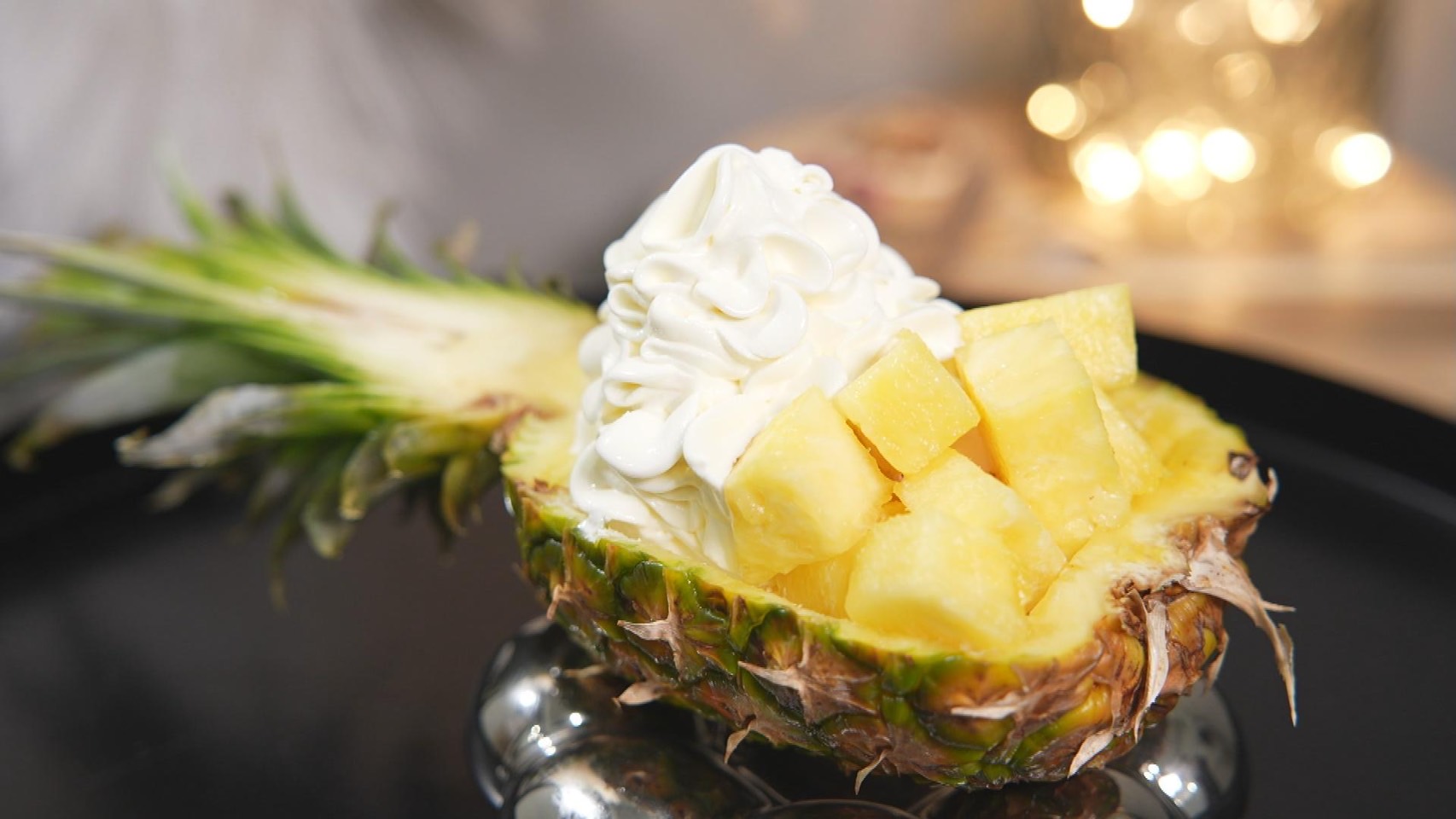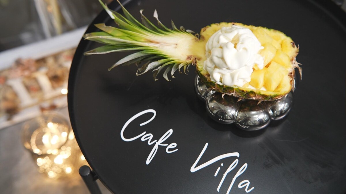(アイキャッチ画像:パイン半玉を使った「花ヴィラとパインとわたし」<Cafe Villa提供>)