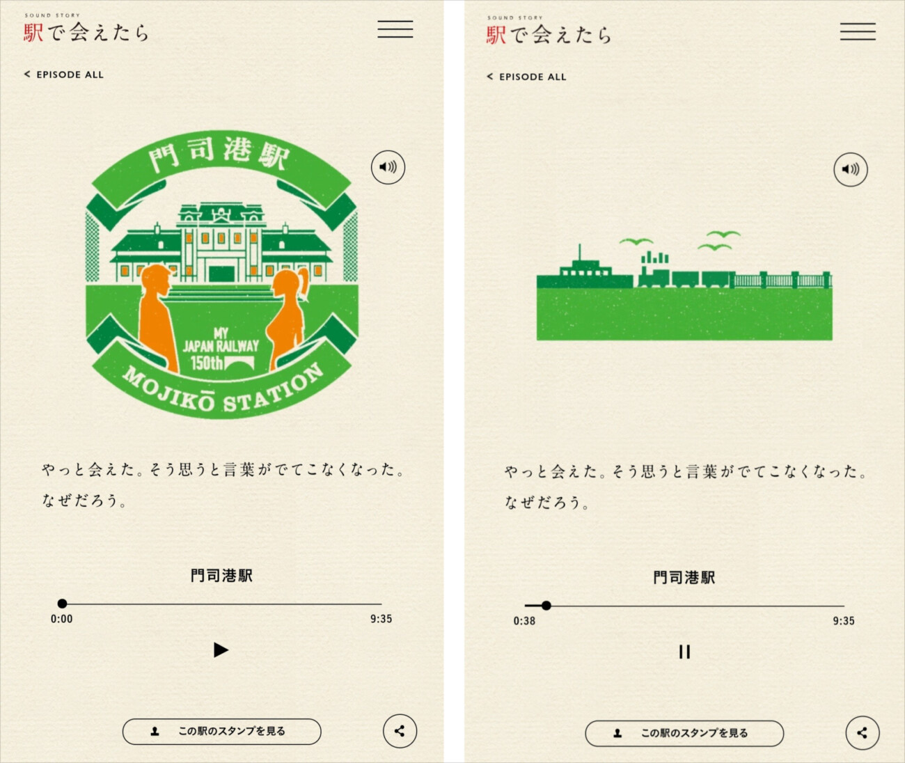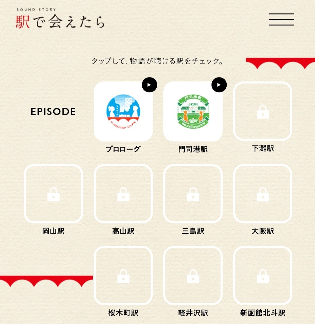 スタンプを押した画面から「この駅のストーリーを聞く」という部分を押し、サウンドストーリー「駅で会えたら」の門司港駅のストーリーをゲット。