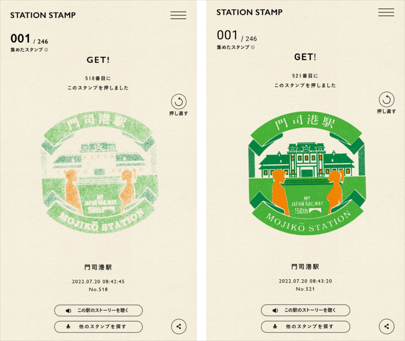 そんなことを知らなかったため、1回目は軽くタップしてしまい、失敗。『押し直す』というところをタップし、濃さや角度が納得いくまでやり直し、ようやく納得いくスタンプを押すことができました。スタンプは現在246種類あるということですが、門司港駅が記念すべき1つめのスタンプとなったのでした。