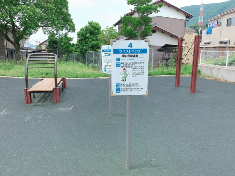 葛原公園の健康広場には、ツイストベンチやストレッチベンチなどの健康遊具が7基並んでいます。