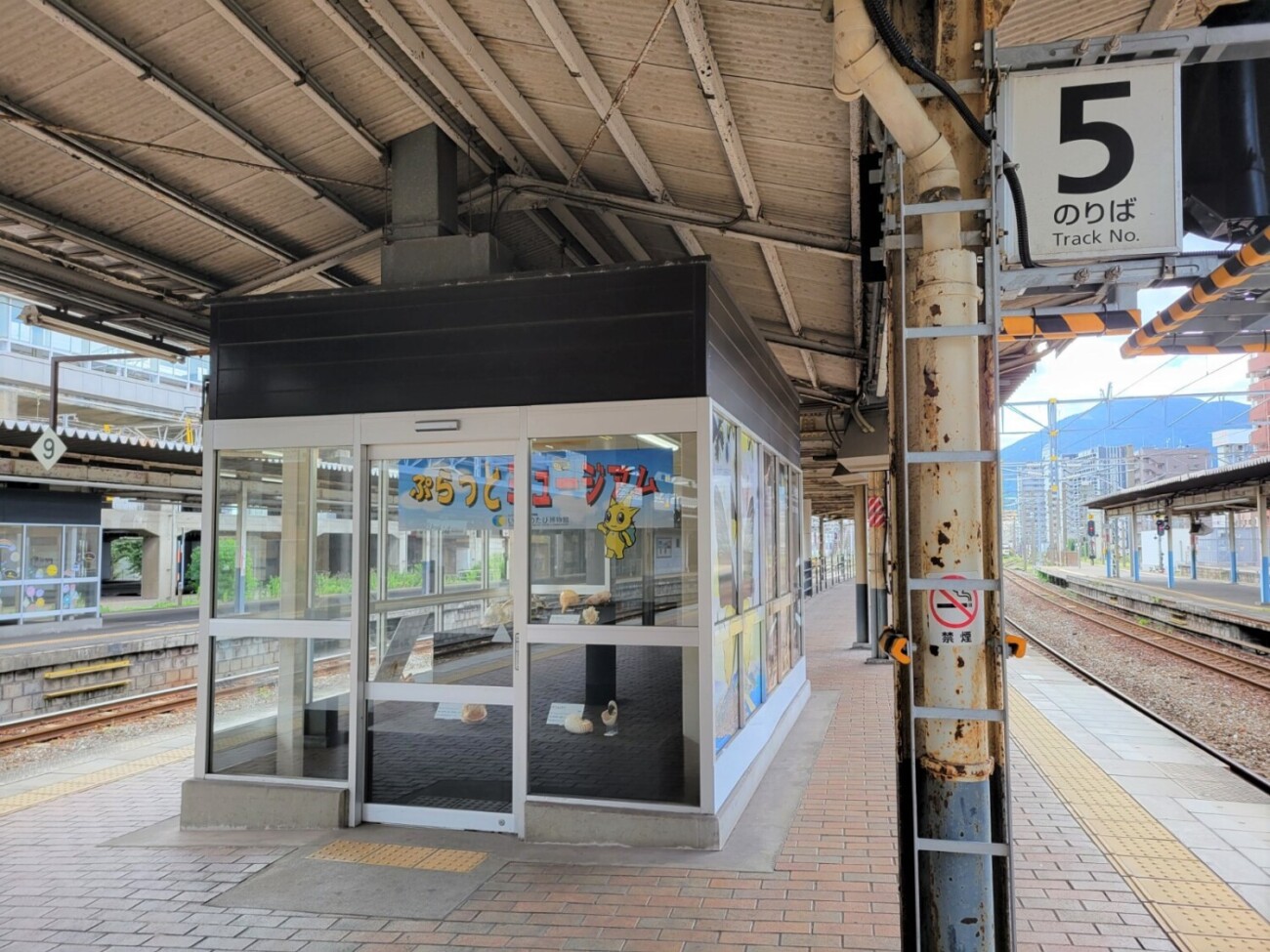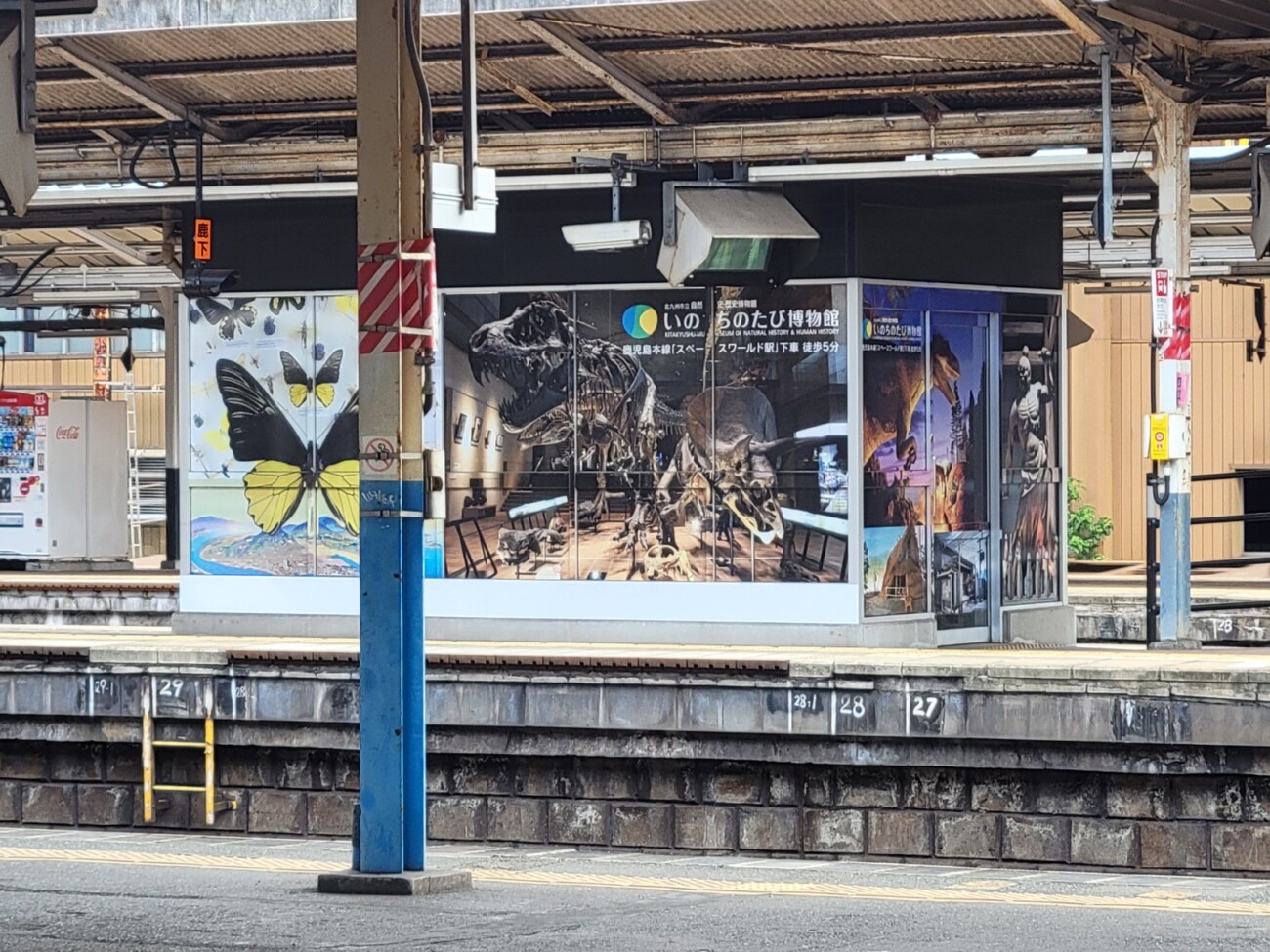 JR小倉駅のホームに立っていると、5・6番ホームに「いのちのたび博物館(北九州市立自然史・歴史博物館 )」の装飾がされたスペースを発見。