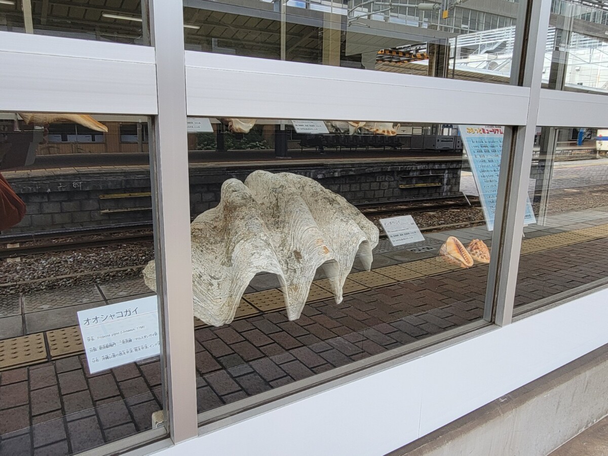 (アイキャッチ画像:駅のホームに展示されている「オオシャコガイ」「マンボウガイ」)