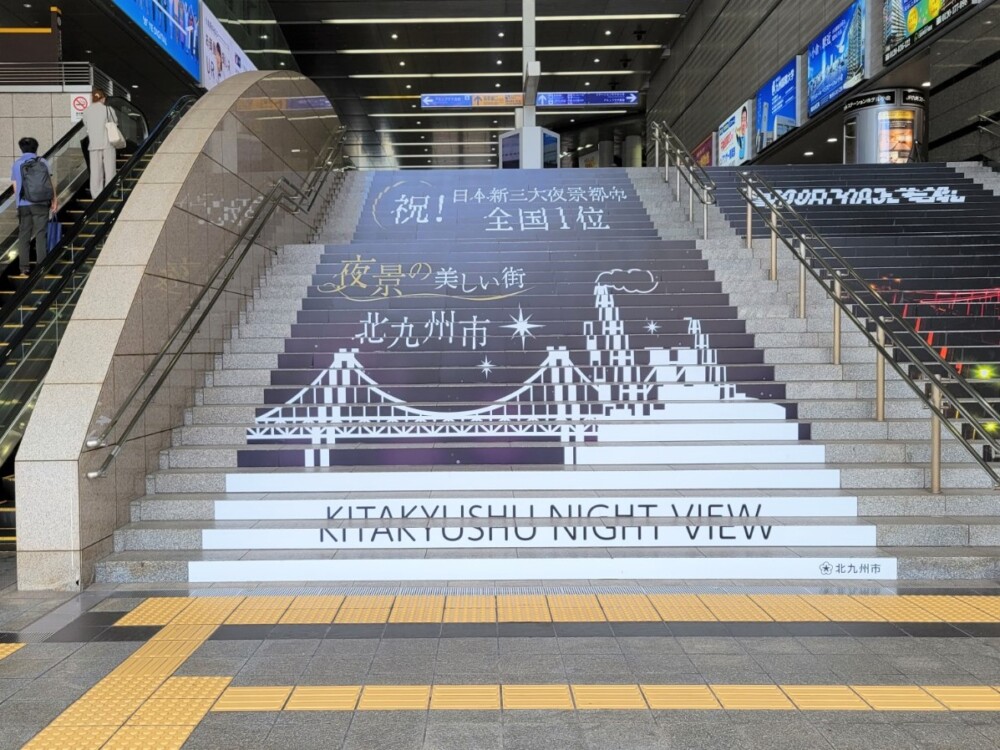 小倉駅小倉城口の階段に今回登場したのは、「夜景の美しい街北九州市」などの文字とともに、北九州市の夜景を象徴する「工場夜景」と今年60周年を迎える「若戸大橋」をイメージしたデザインのイラストが描かれたものです。