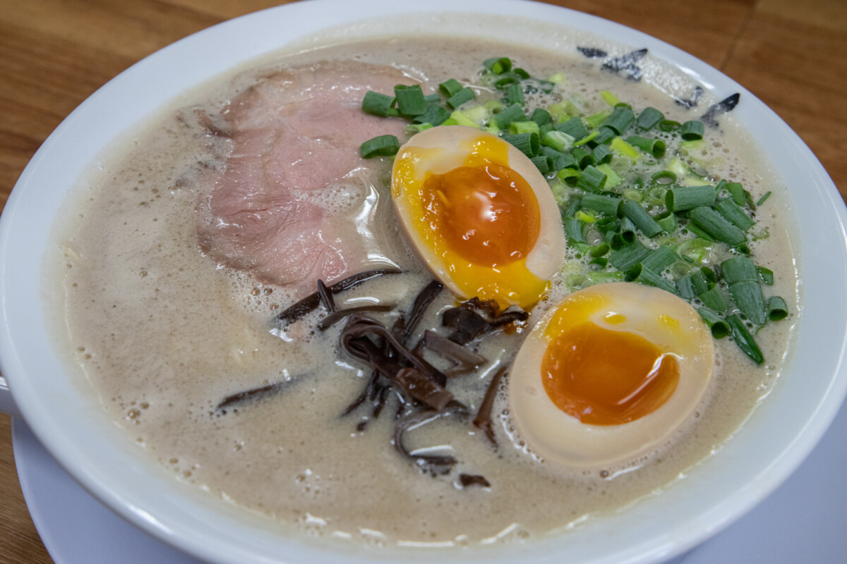麺は中細のストレート麺で、博多ラーメンの硬い麺と比べるとやや柔らかく感じるかもしれませんが、ザラっとしたスープとよく絡んで相性は抜群です。煮玉子は口に入れるとたちまちとけてしまうようなトロトロ具合で、麺と絡めて食べるとこれもまた絶品です。