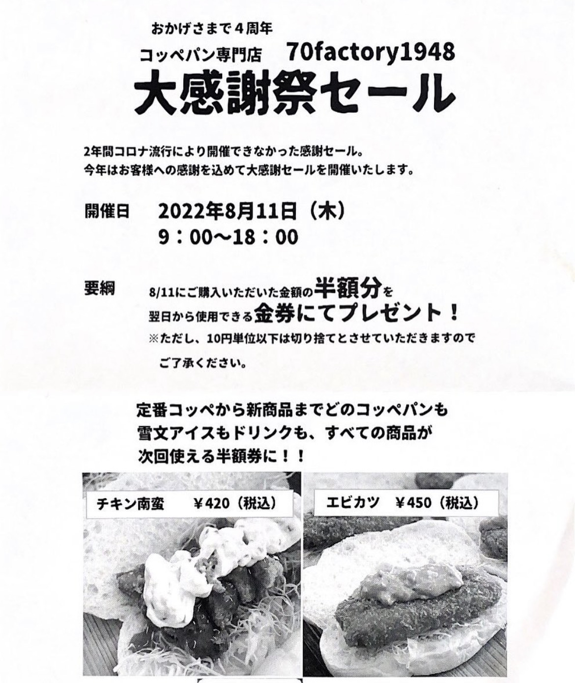4周年記念『大感謝祭』 コッペパン専門店「70 factory 1948」【北九州市八幡東区】