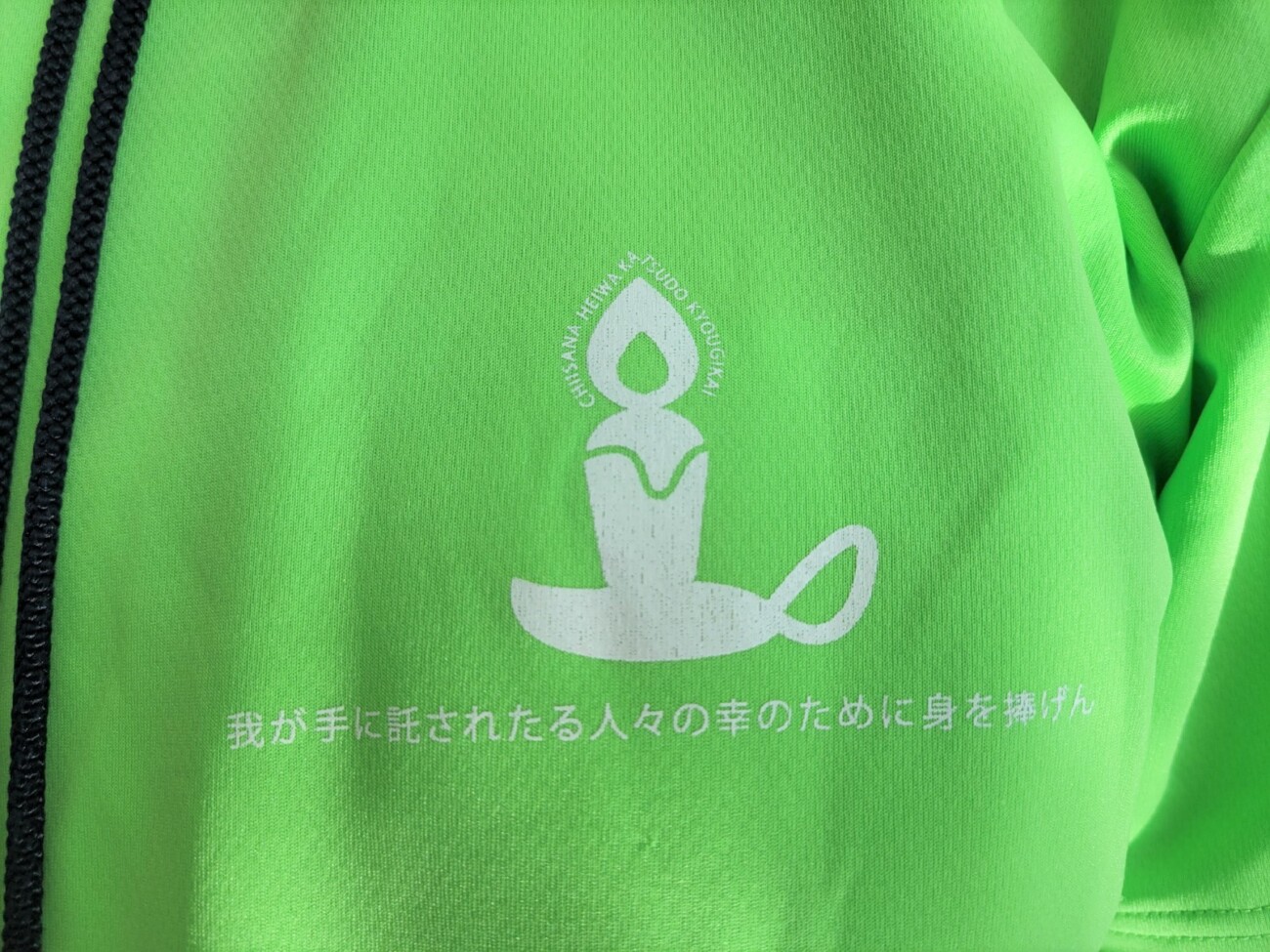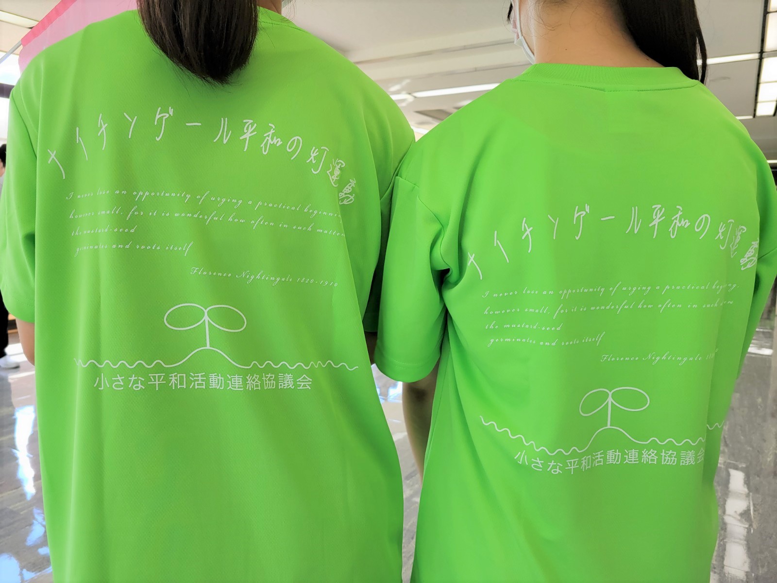今回、「ナイチンゲール平和の灯運動」に参加したメンバーたちは、黄緑色の揃いのTシャツを着ていますが、そこには「我が手に託されたる人々の幸のために身を捧げん」という「ナイチンゲール誓詞」の一文もデザインされていました。