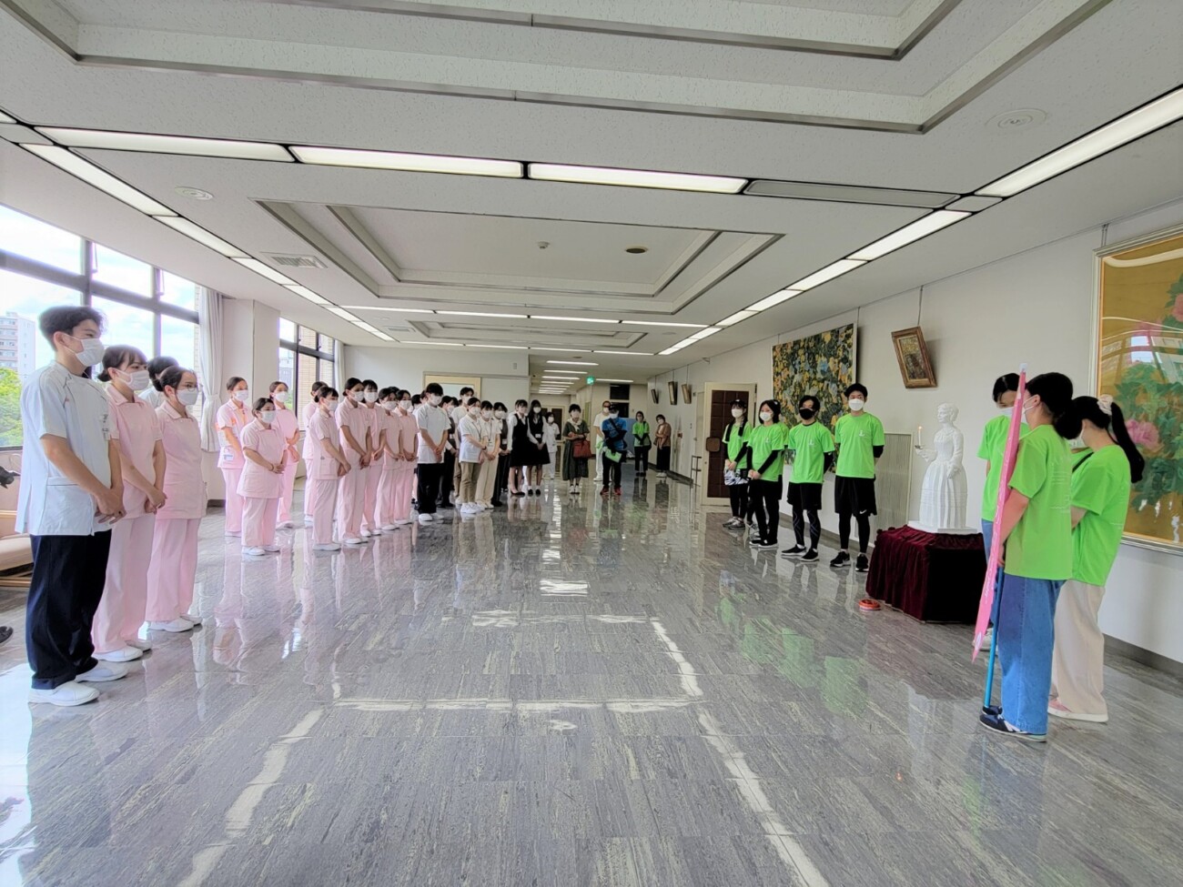 昨年は4校が参加しましたが、今年は「北九州看護大学校」(北九州市小倉南区)、「八幡医師会看護専門学院」(北九州市八幡東区)、「直方看護専修学校」(直方市)、「麻生看護大学校」(飯塚市)、「鳥栖三養基医師会看護高等専修学校」(鳥栖市)、「佐賀県医療センター好生館看護学院」(佐賀市)、「武雄看護学校」(武雄市)、「嬉野医療センター附属看護学校」(嬉野市)、「向陽学園看護専攻科」(大村市)の9校の学生約45人が参加。
