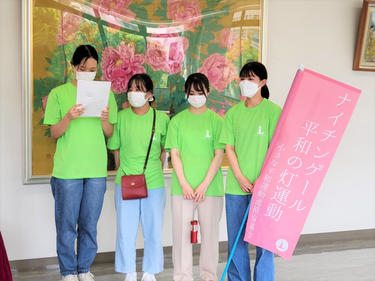 この場では、「ナイチンゲール平和の灯運動」のために寄せられた長崎市長、田上富久さんからのメッセージを北九州看護大学校メンバーが読み上げました。
