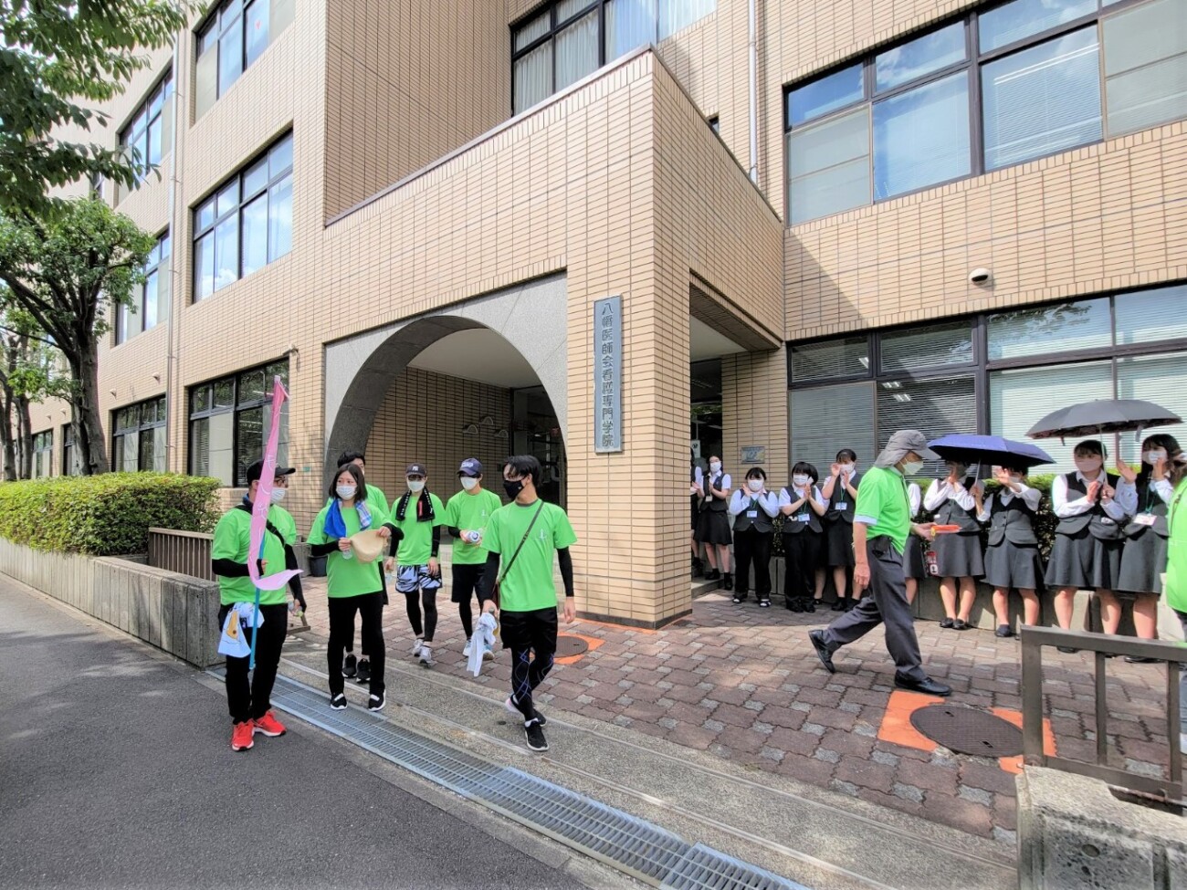 小倉北区勝山公園から八幡東区まで暑い中、歩いてきた北九州看護大学校のメンバーたちに、八幡医師会看護専門学院の学生たちが冷たい飲み物やお菓子などを差し入れ、交流する様子も見られました。