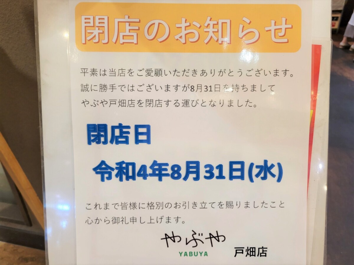 イオン戸畑ショッピングセンターの1階にある食事どころ「やぶや 戸畑店」が、8月31日をもって閉店することが分かりました。