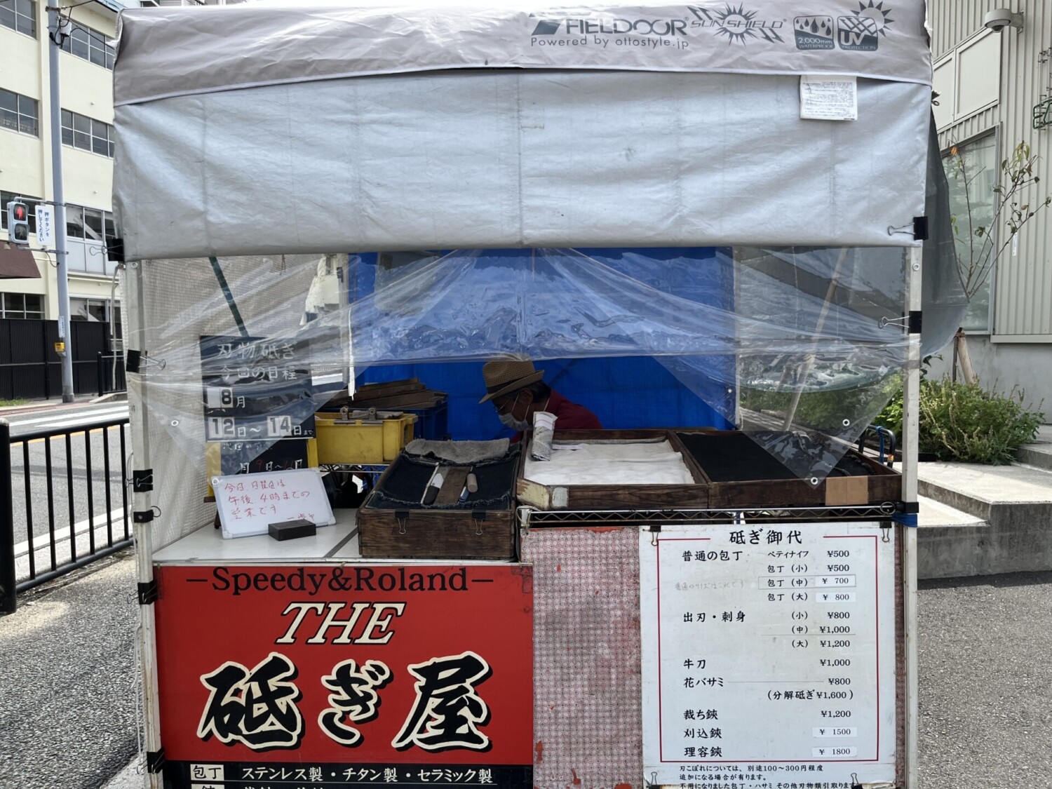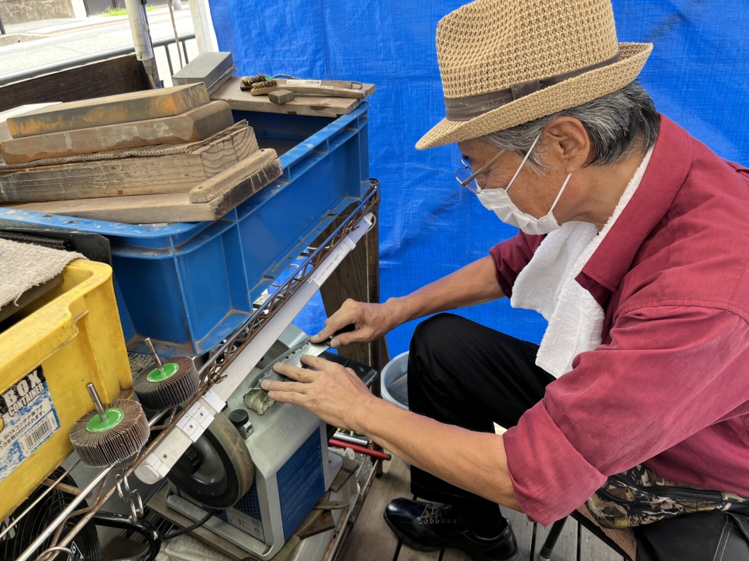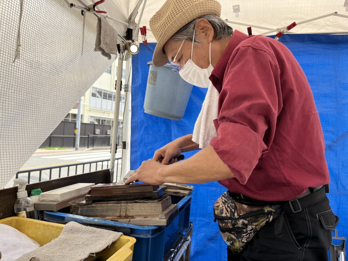 戸畑区一枝の江崎ストア前で、毎月第2金・土・日曜日に店開きしている砥ぎ屋さん「一歩ヤ」。