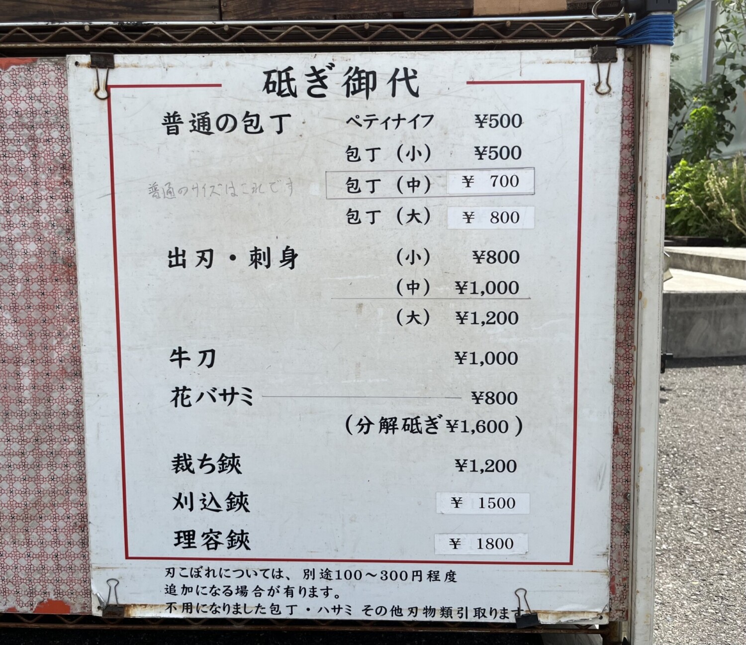砥ぎ代は、果物ナイフが600円、家庭サイズが700円。調べてみると1000~2000円のお店が多かったので、かなりお得に砥いでもらえるようです。