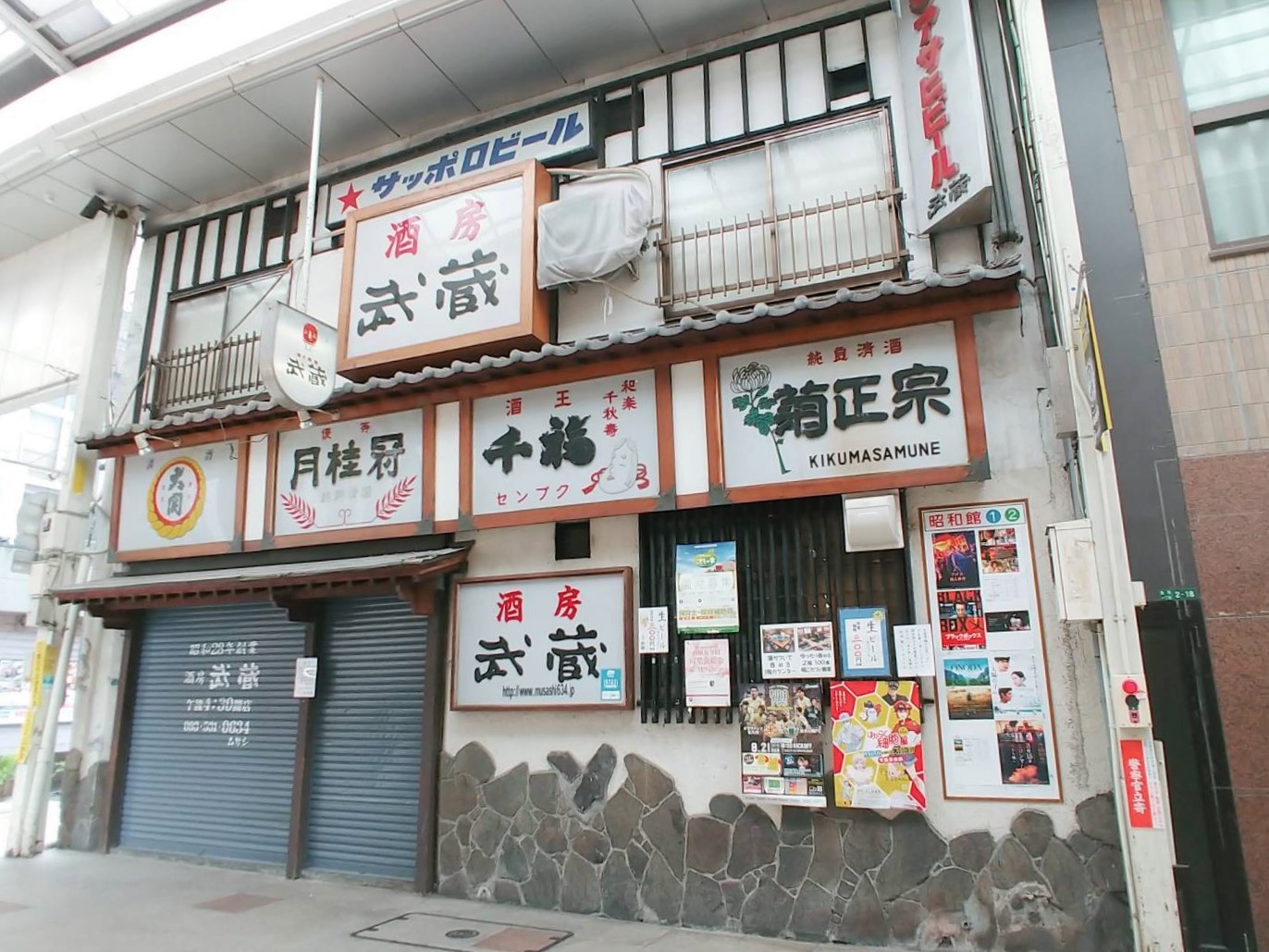 魚町銀天街内にある居酒屋「酒房 武蔵」の店先には小倉昭和館PRコーナーがあります。