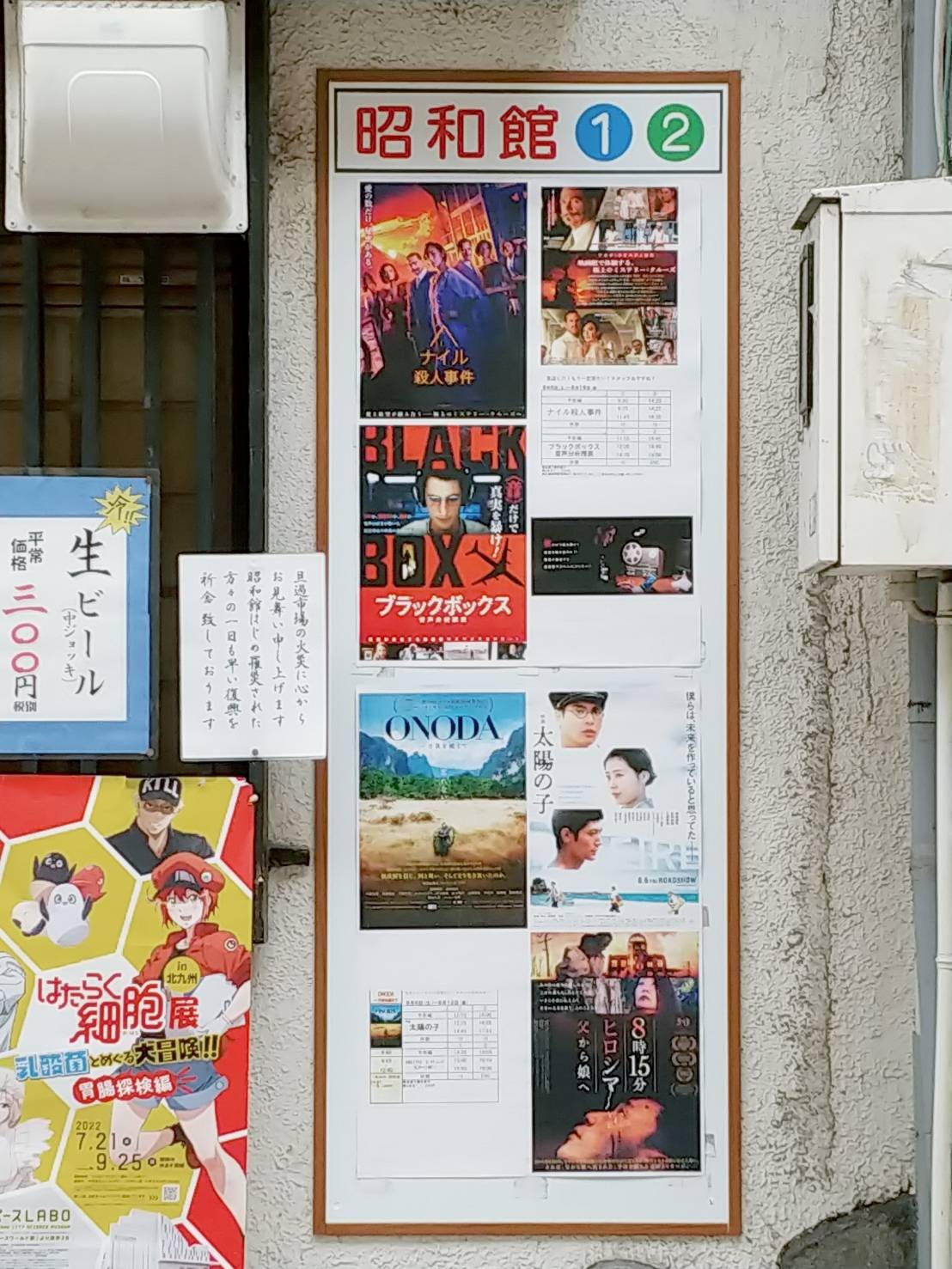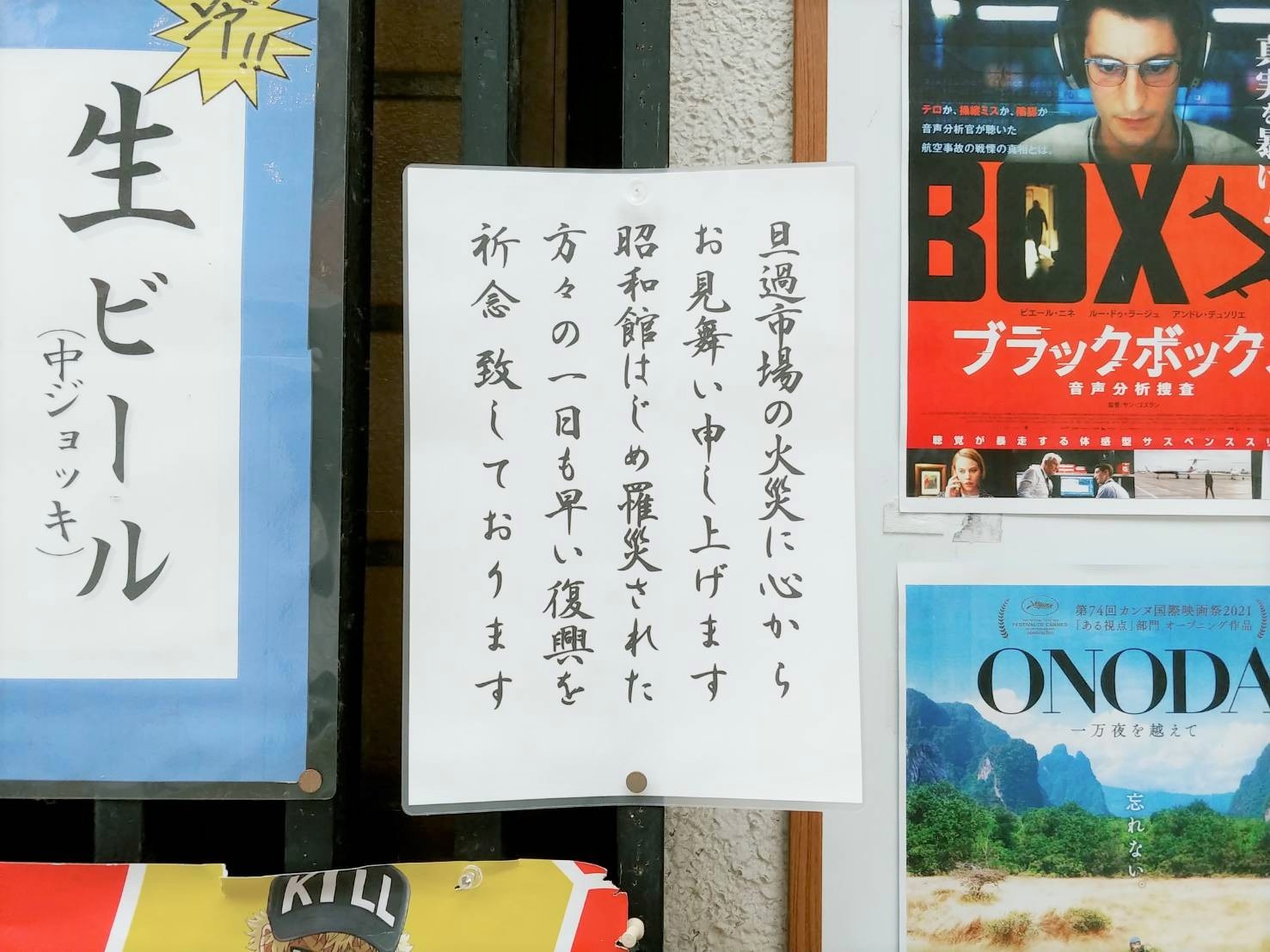 小倉の街なかには、小倉昭和館がいまどういった作品を上映しているかを案内するポスターやチラシなどを貼っている場所が複数ありましたが、そのうちの2カ所で小倉昭和館への応援メッセージが掲示されているのを発見しました。